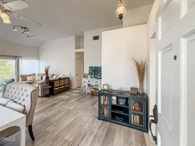 Located in a quiet, gated enclave, this beautifully remodeled 2-bedroom, 2-bath end unit offers rare privacy with no neighbors on one side and elevated views from its second-floor perch. The private entry is a simple walk-up with no one above you, no one beside you.Inside, an open-concept layout is bright and inviting, with natural light flowing across upgraded wood-look flooring. The kitchen is both functional and stylish, featuring quartzite countertops, stainless steel appliances, and soft-close custom cabinetry with pull-out shelving.Both Bathrooms have been thoughtfully updated with clean, contemporary finishes, spa-style showers, and modern vanities. The spacious Bedrooms are designed for rest and relaxation, with generous closet space and a quiet setting ideal for a good night’s sleep. The Living Area features a cozy fireplace and opens to a private terrace perfect for unwinding with a book or hosting friends on a mild Camarillo eveningAdditional upgrades include plantation shutters, a newer HVAC system, and a detached garage with a brand-new door.Community amenities include a sparkling pool, spa, fitness center, clubhouse, and walking trails all tucked within a peaceful, landscaped setting. With golf, shopping, dining, and the coast just minutes away, this home delivers convenience, comfort, and lifestyle in one complete package.