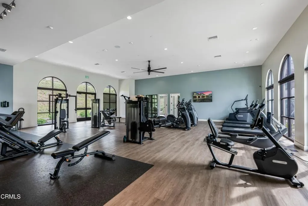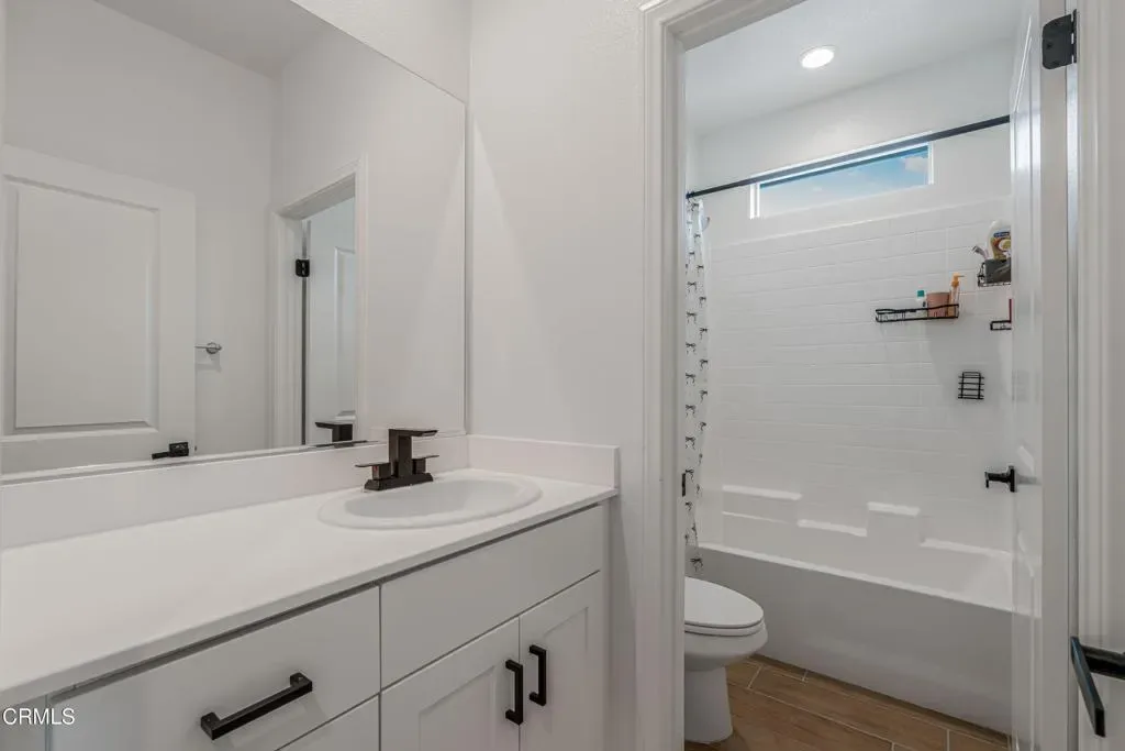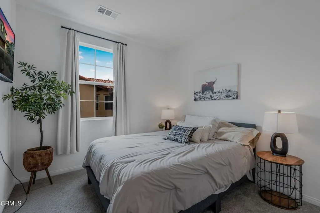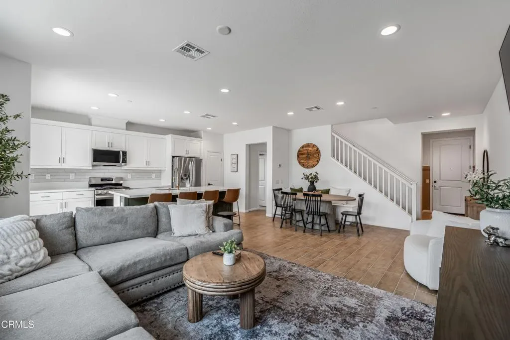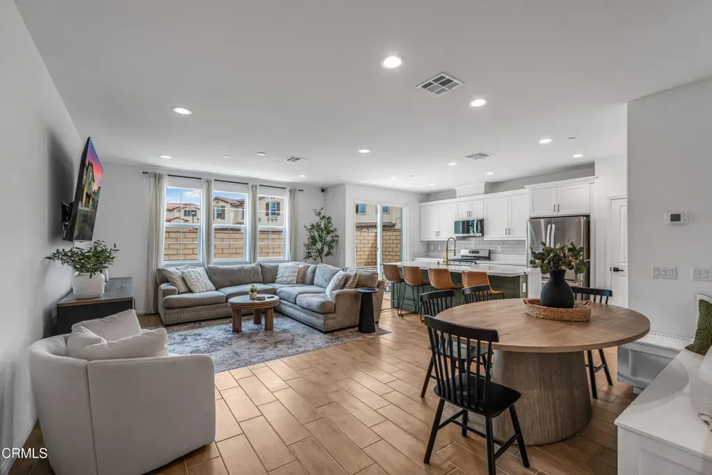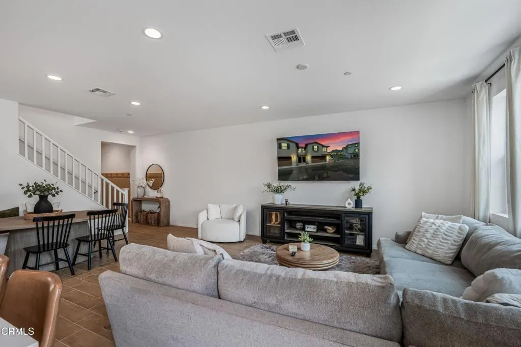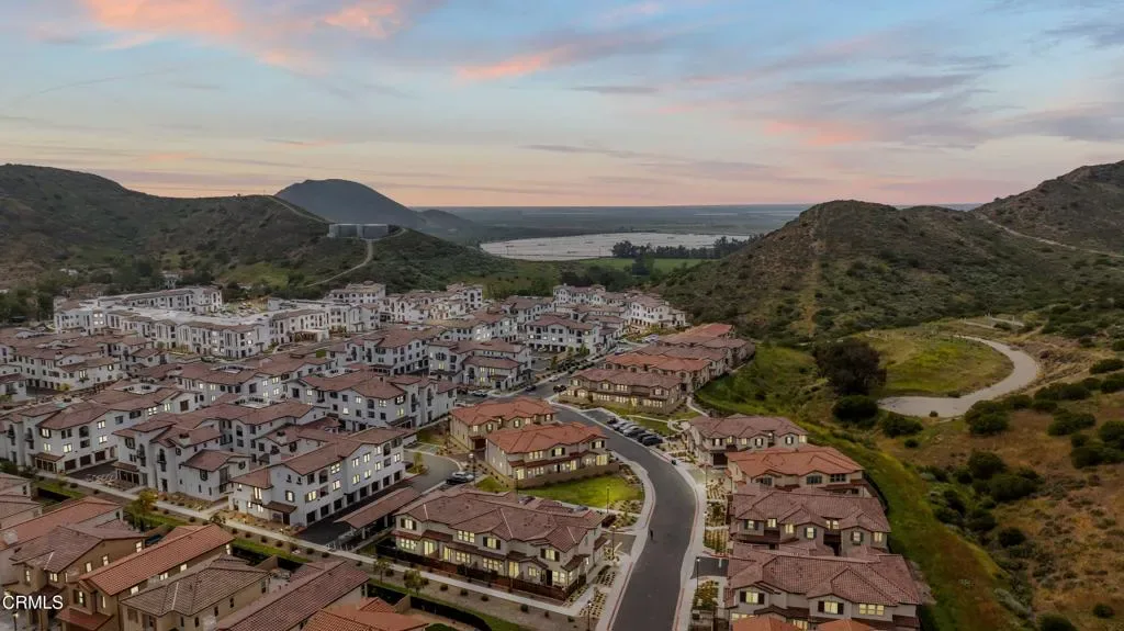 Welcome to this beautifully upgraded four bedroom, two and a half bath home offering approximately 1,725 square feet of thoughtfully designed living space in the sought-after Anacapa Canyon community of Camarillo. This desirable end unit features extra windows that fill the home with natural light and showcase the area’s pleasant coastal climate.The main living area centers around a stylish upgraded kitchen featuring custom countertops and backsplash, a large island with shiplap accents, deep recessed sink, stainless steel appliances, and bar seating. Tile flooring spans the main level, complemented by built-in bench seating with hidden storage. A pantry and additional storage closet add convenience, while the open layout seamlessly connects the kitchen, dining, and living areas, ideal for entertaining. Upstairs, the primary suite offers a spacious walk-in closet and an upgraded ensuite bathroom with dual vanities, custom tile, and a walk-in shower with built-in bench. Scenic mountain views enhance the space. Additional bedrooms and an upstairs laundry area complete the second level. Outdoor living includes a built-in fire pit and seating area, perfect for relaxing or hosting. Additional features include central air conditioning, a direct access two car garage with finished flooring, built-in bar with storage, tankless water heater, and whole-house water softener. Black and gold hardware throughout and an upgraded entryway with beadboard wainscoting add a modern touch. Residents enjoy resort-style amenities including a park, dog park, clubhouse with kitchen, billiards and shuffleboard, pool, children’s pool, two spas, fitness center with yoga studio, BBQ areas, and scenic walking trails.