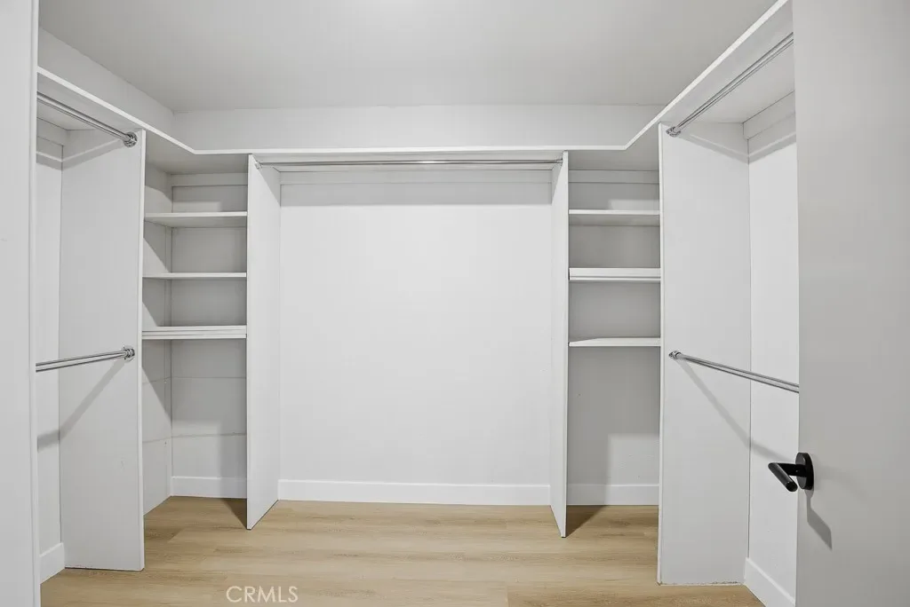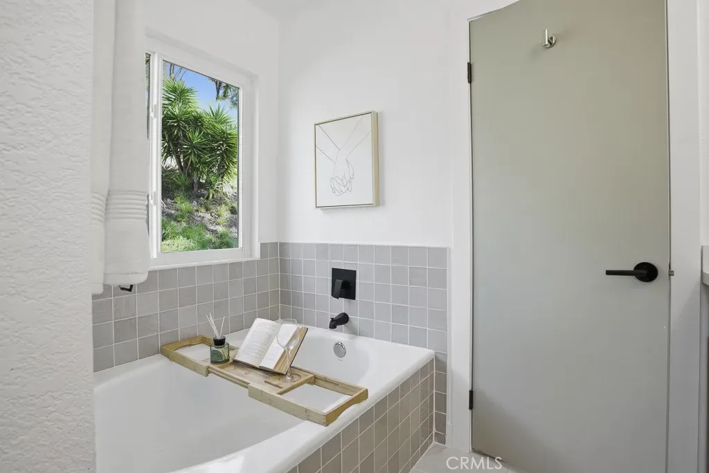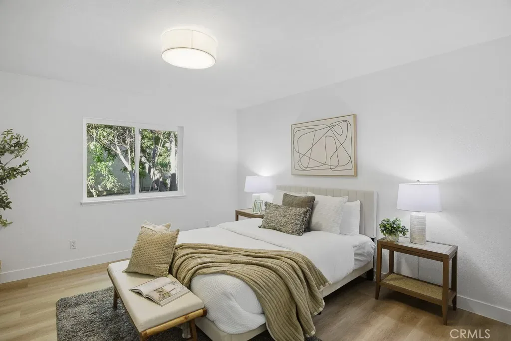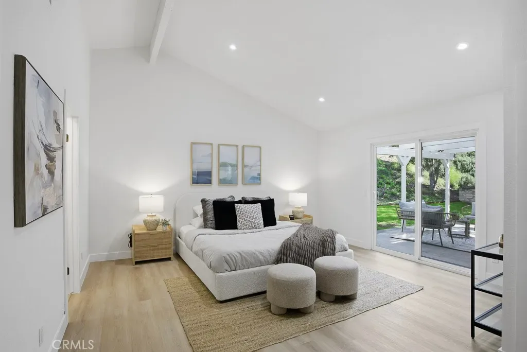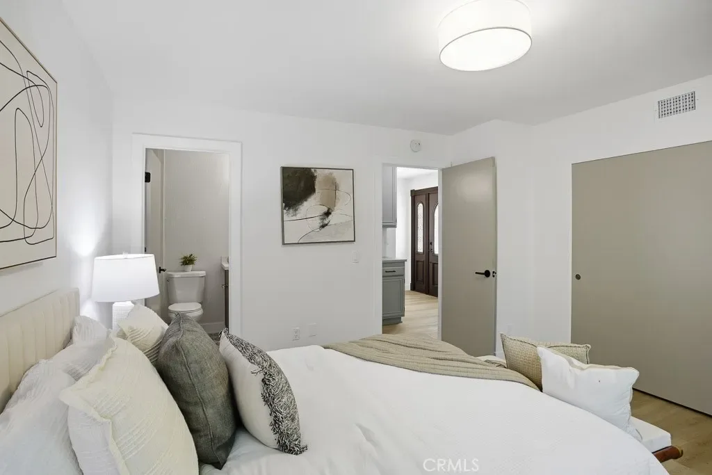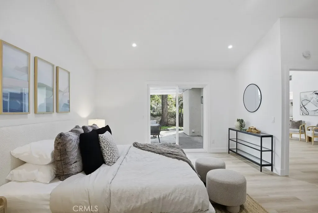 The spacious primary suite offers ample room and natural light, direct patio access, vaulted ceilings, and a generous walk-in closet. The ensuite bathroom includes dual sinks, updated fixtures, and a tiled walk-in shower. The secondary bedroom features ample storage and direct access to a remodeled Jack-and-Jill–style bathroom.