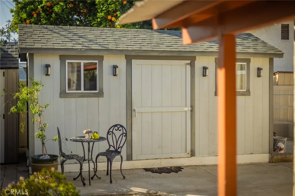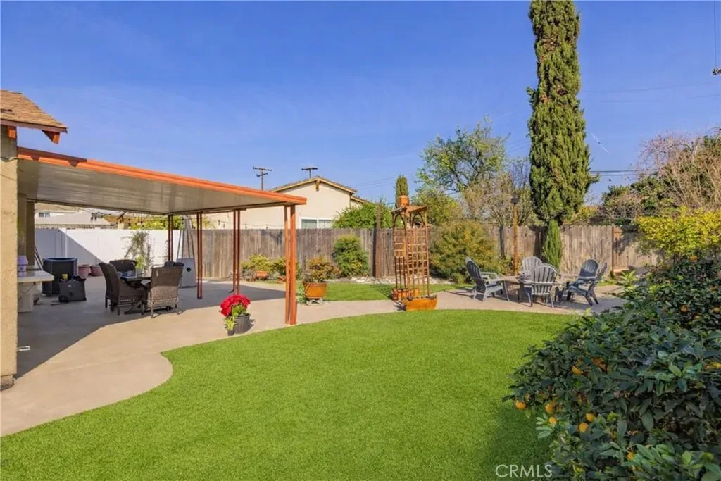 The redesigned backyard is ideal for relaxing or entertaining, complete with a gas fire pit, fountain, garden space, ambient lighting, and a spacious shed, with plenty of room for a future ADU or expanded outdoor living area.