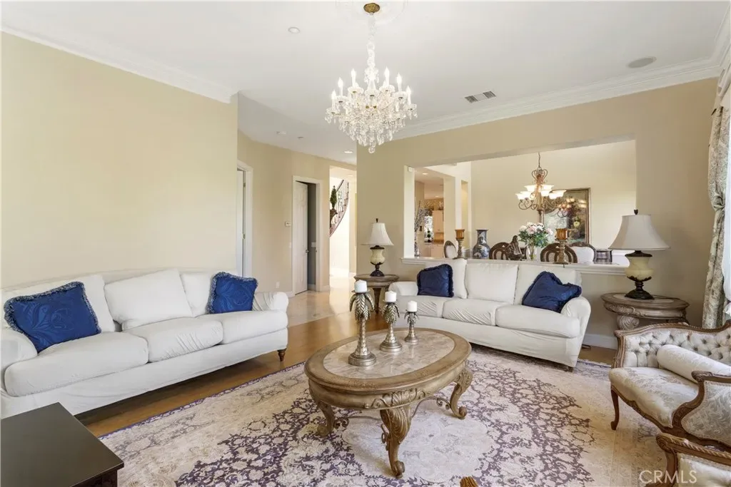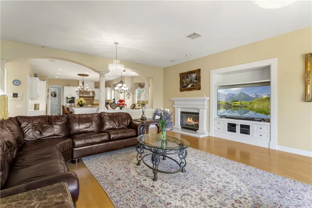 The elegant family room features a custom fireplace, while expansive living spaces showcase custom lighting, travertine and hardwood flooring throughout.