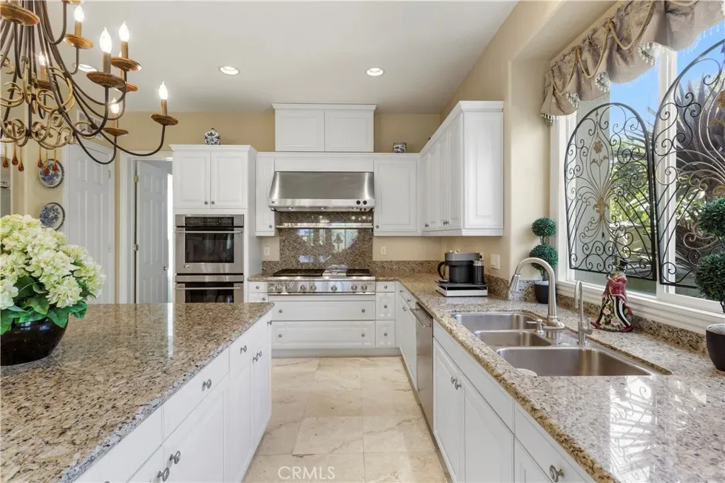 The gourmet kitchen is designed for both everyday living and entertaining, featuring stainless steel appliances, a 6-burner stove with grill and warming drawer, upgraded cabinetry, granite countertops, a large center island, and a butler’s pantry.