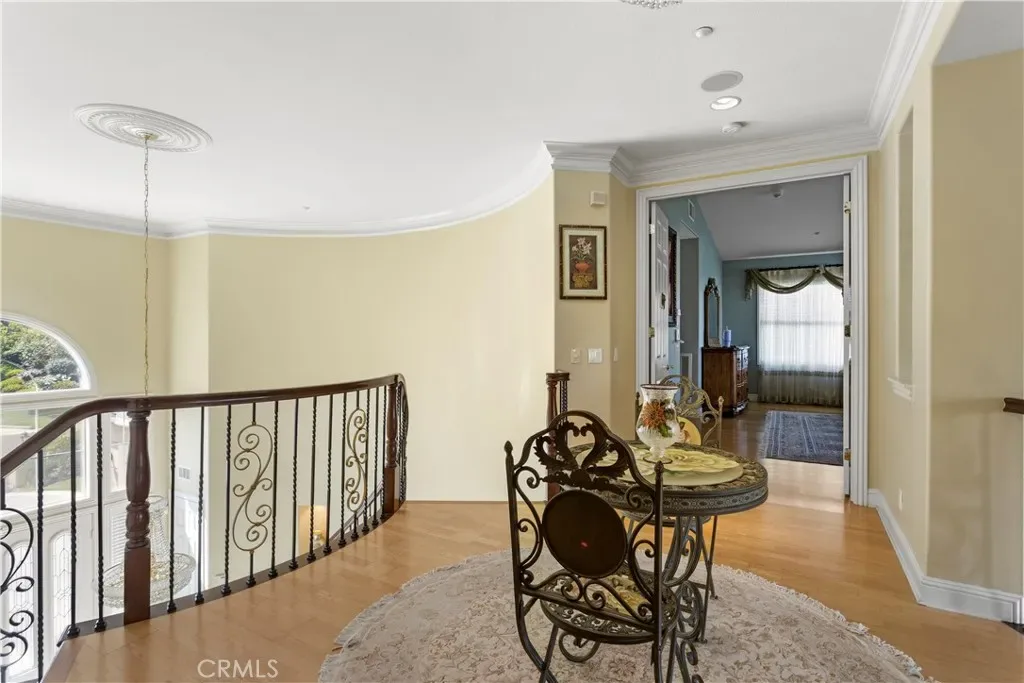 Inside, dramatic double wrought-iron staircases create a striking first impression. The spacious floor plan offers 5 bedrooms plus an office/library with French doors, perfect for working from home.