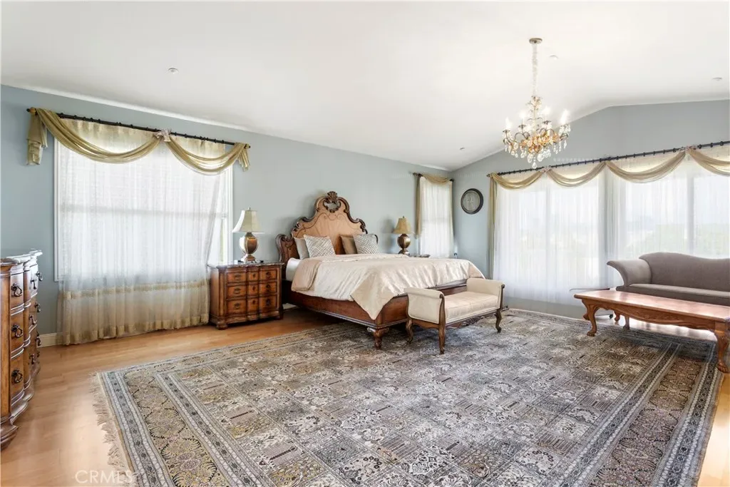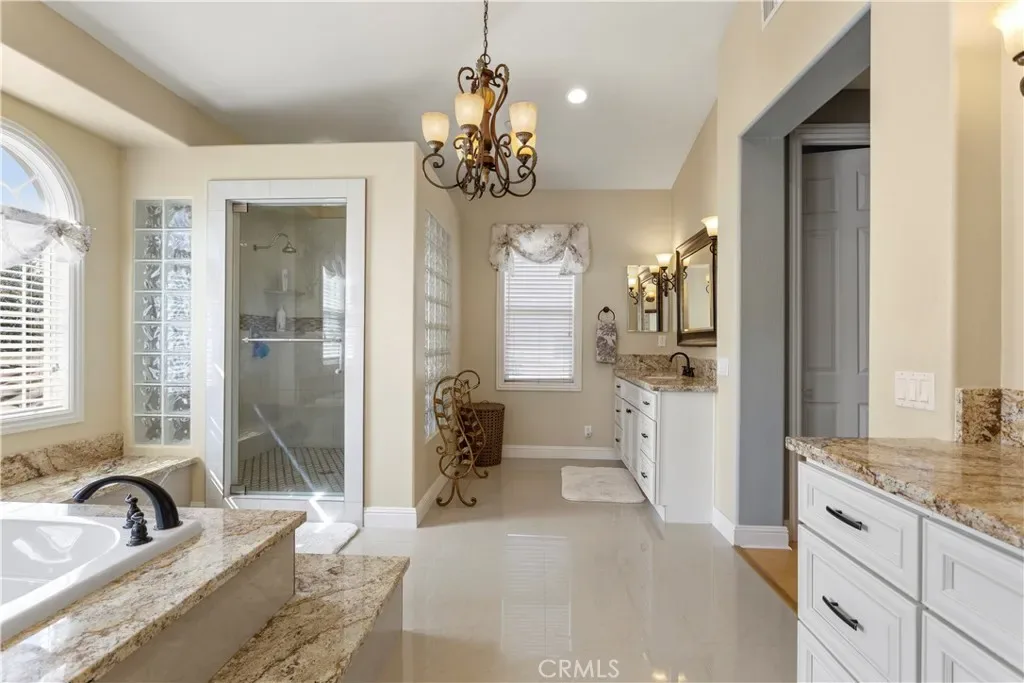 The luxurious primary suite offers a private balcony with stunning views of sunsets and city lights, along with a cozy fireplace and a convenient morning kitchen. The completely remodeled spa-inspired primary bathroom features a Jacuzzi tub, oversized shower enclosure, and dual vanities.
