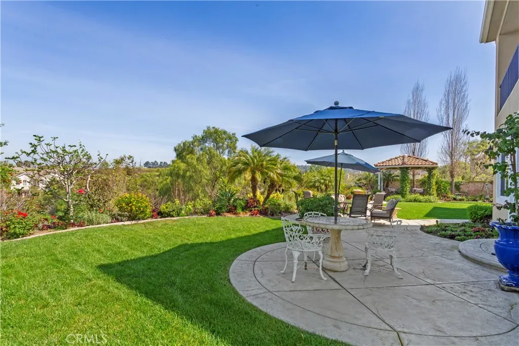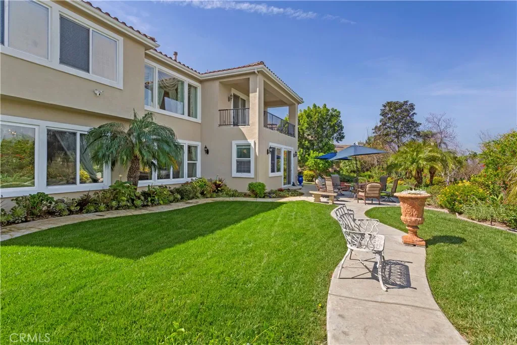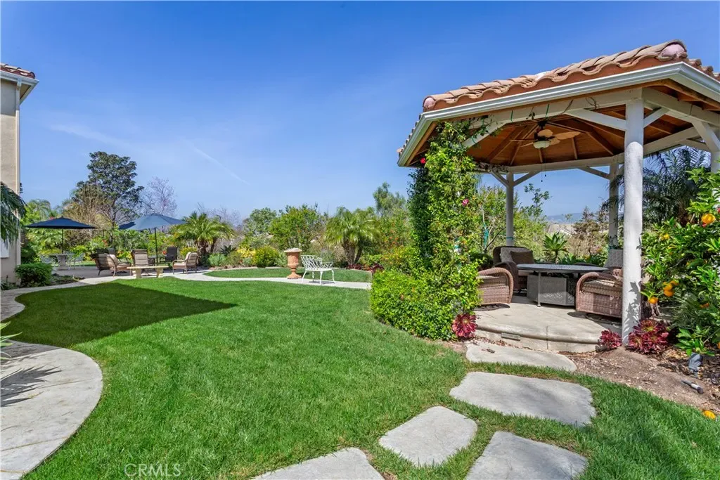 The beautifully landscaped backyard creates a private garden retreat with numerous mature fruit trees, including persimmon, plum, peach, pear, pomegranate, apple, avocado, grapevines, fig, and many more varieties—perfect for enjoying fresh homegrown fruit and outdoor living.