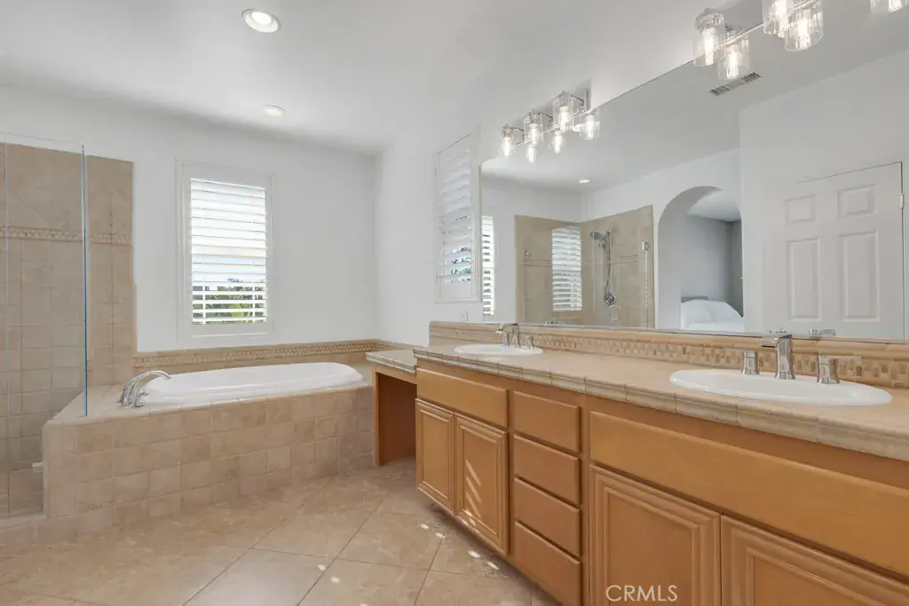 Upstairs, the generous primary suite provides a relaxing retreat with an ensuite bathroom featuring updated glass shower doors, a jetted soaking tub, dual sinks, a dedicated seated makeup vanity, a private water closet, and a spacious walk-in closet. Two secondary bedrooms offer plenty of natural light and ample closet space, while the additional full bathroom includes dual sinks and a tub/shower combination. The upstairs laundry room adds everyday convenience and includes a utility sink.