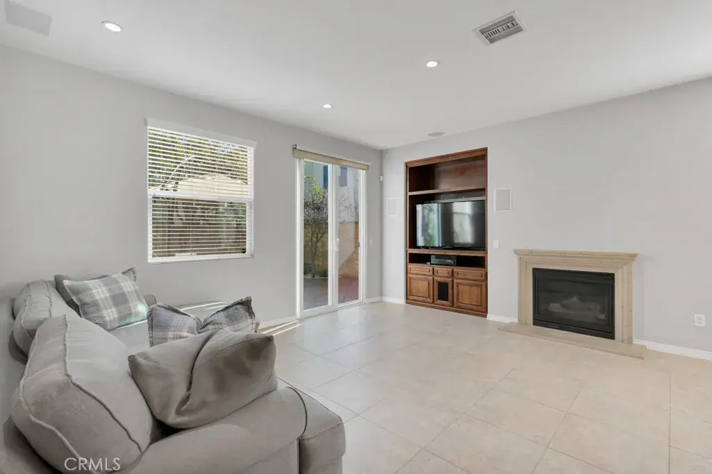The family room offers a cozy setting with a gas fireplace and built-in media shelving, the perfect place to unwind at the end of the day.
