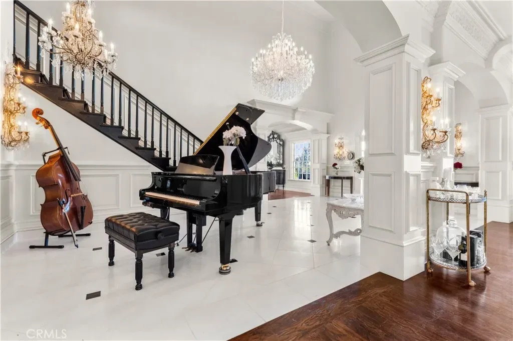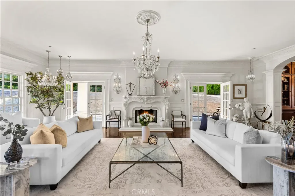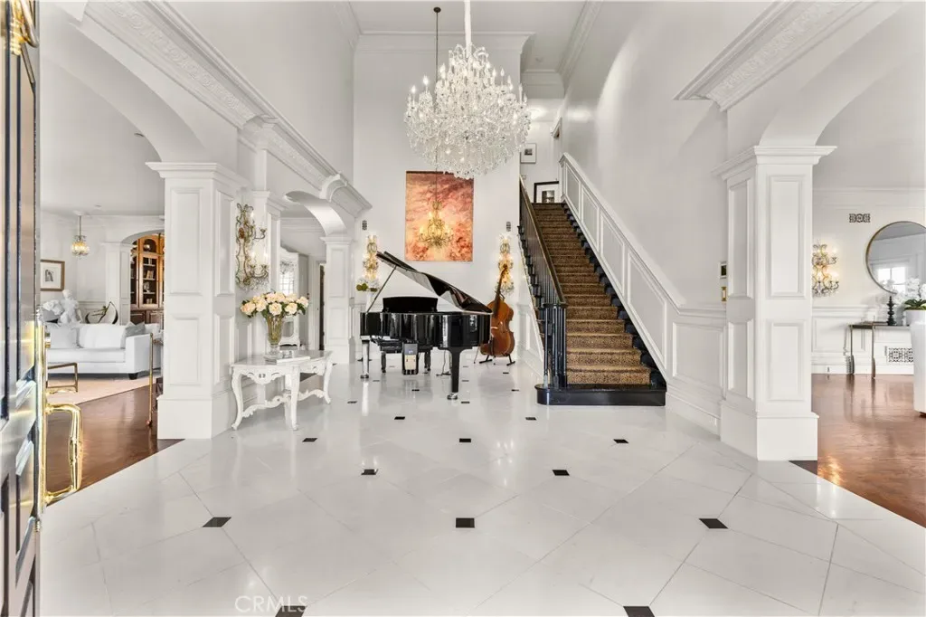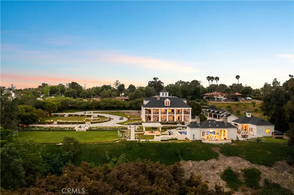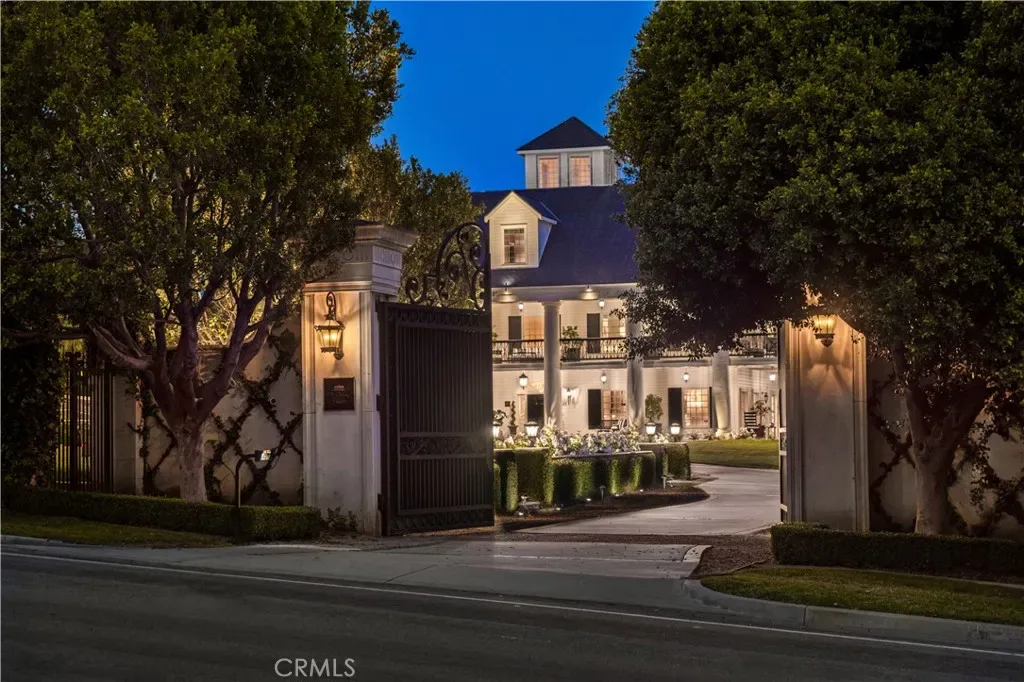 Palatial colonial-style main residence with 35-foot entry ceilings, library, gourmet kitchen, formal dining room, and expansive entertainment areas