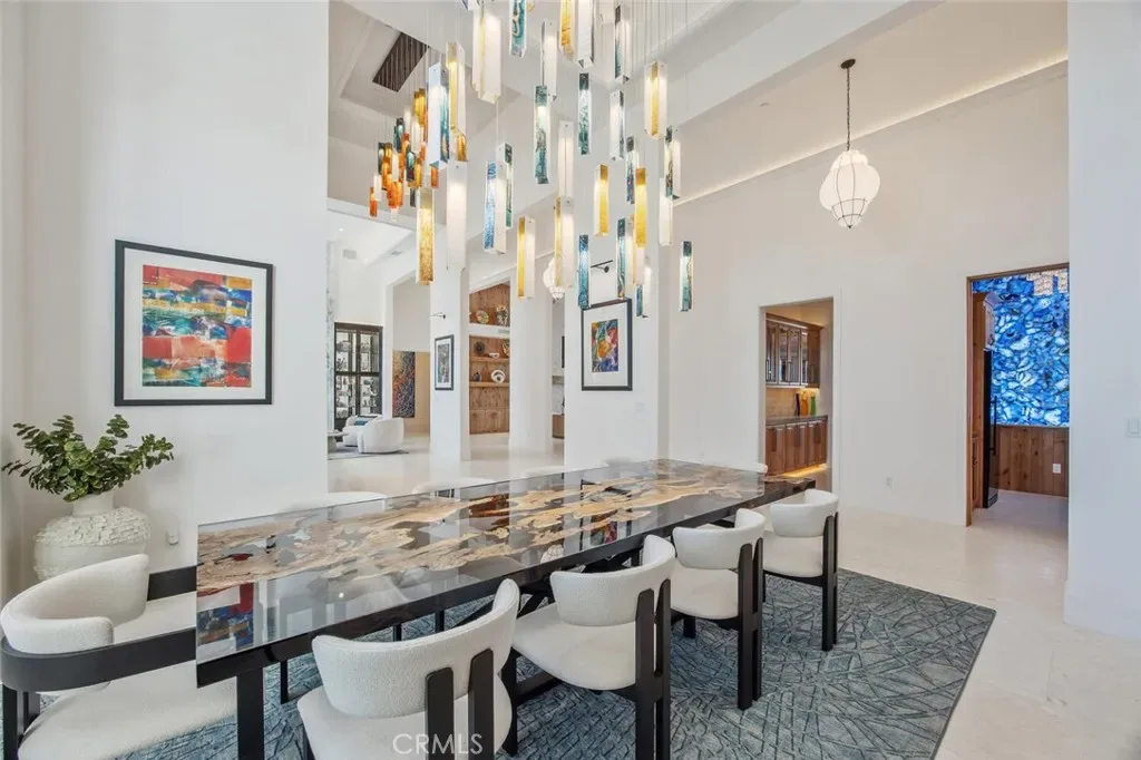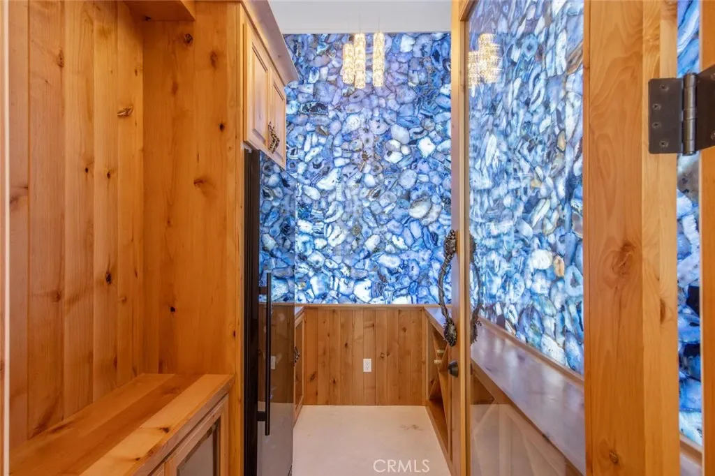The wine room is a statement piece, clad in backlit gemstone slabs with custom alder racking and a 70-bottle refrigerator. A 50-foot gallery hallway leads to a show-stopping powder room and into thoughtfully designed private spaces, including a tiered theater with 140-inch screen and full bar, and a sophisticated study with quartzite fireplace and French doors opening to a secluded patio.