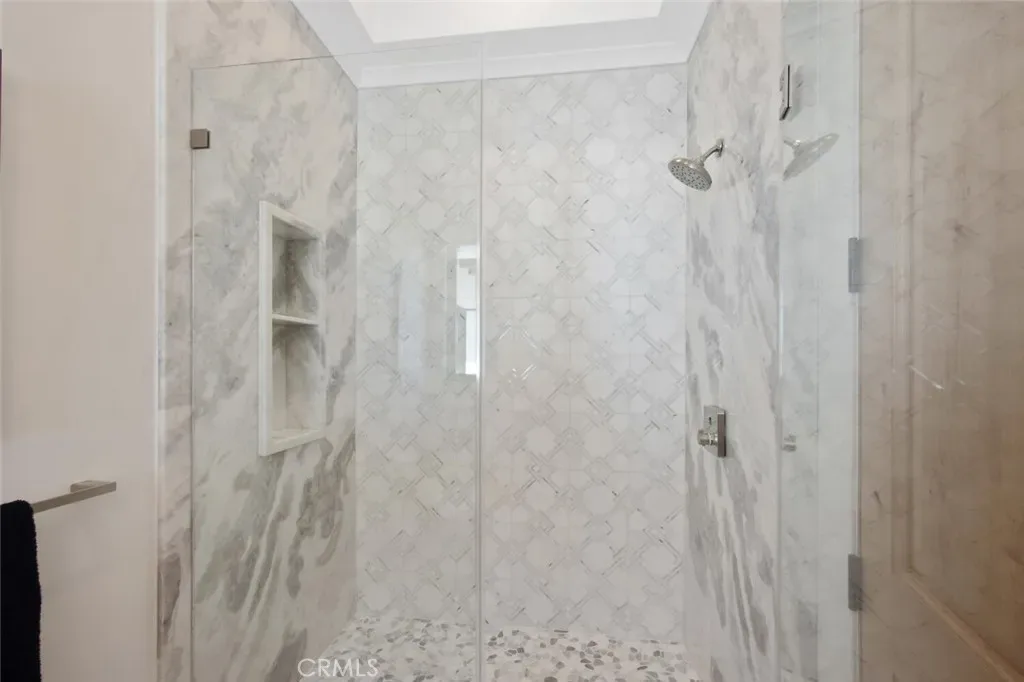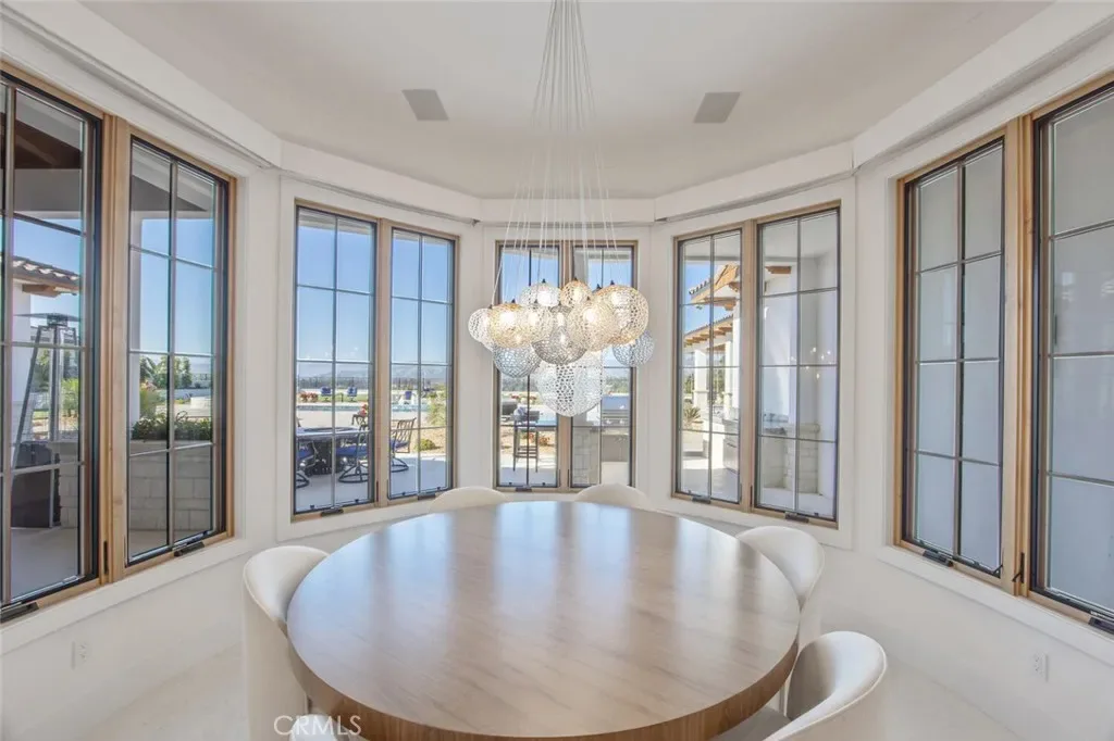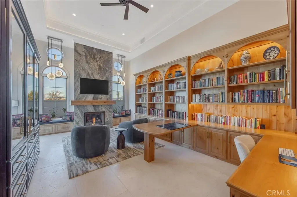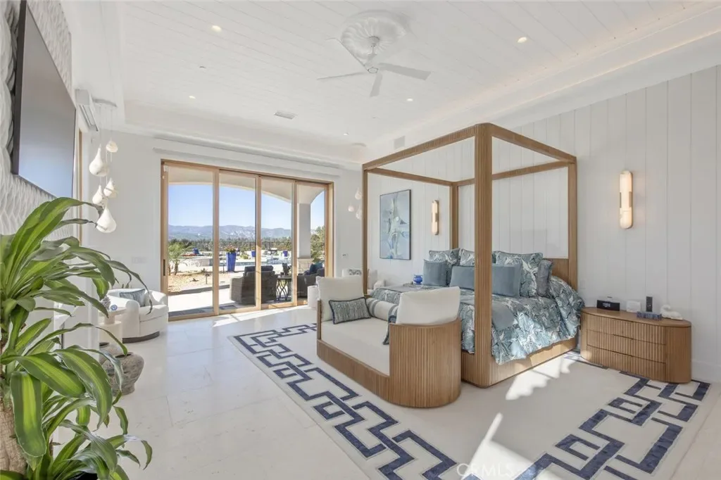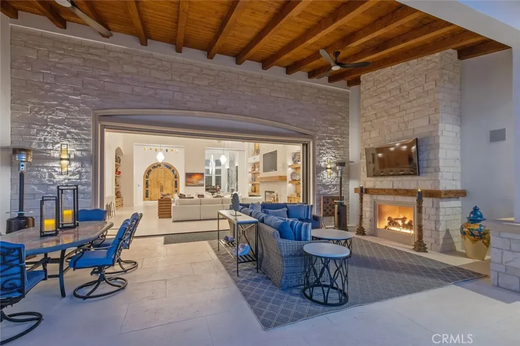 Outside, the gated motor court with permeable pavers leads to an oversized three-car garage. The resort-style grounds showcase a covered patio with wood-paneled ceiling, stone fireplace, and outdoor kitchen. The beach-entry pool features a 10-foot spa, waterfall, fire bowls, and tranquil fountain, complimented by designer pavers.