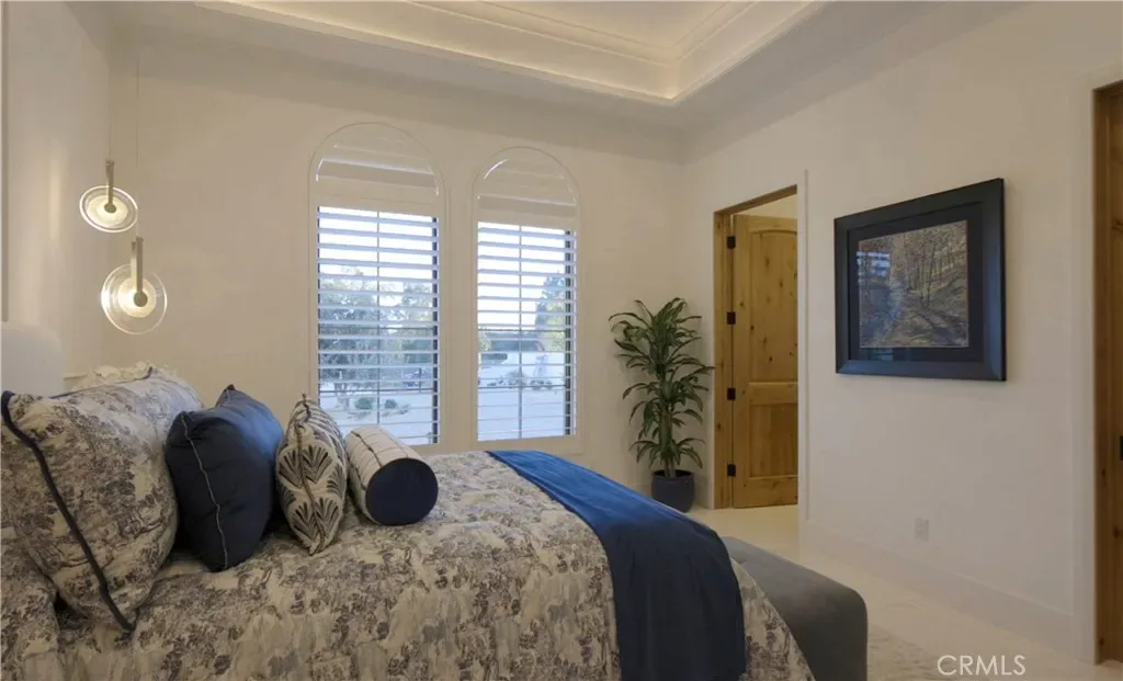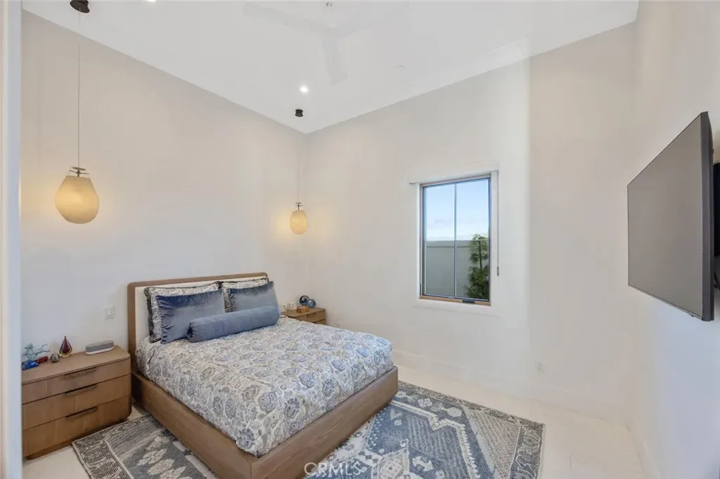 Three secondary bedroom suites feature bespoke finishes and private baths, with one currently styled as a gym overlooking pool and mountain views. The primary suite is a retreat of its own, complete with fireplace, nano doors to the yard, dual custom walk-in closets, and a spa-inspired bath offering a sculptural soaking tub, quartzite vanities, and an oversized backlit quartzite steam shower.