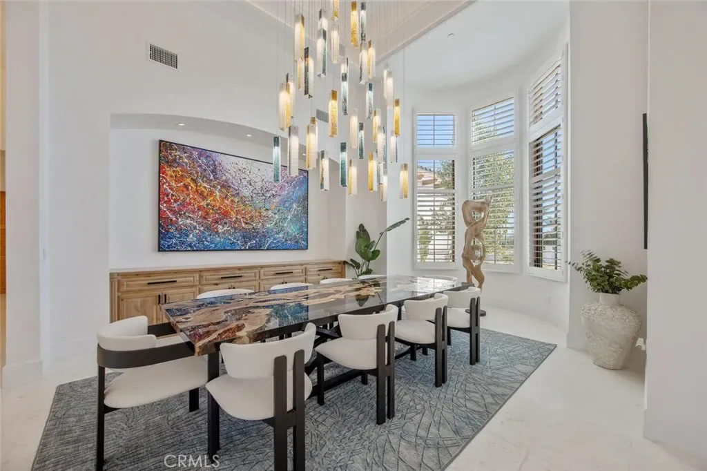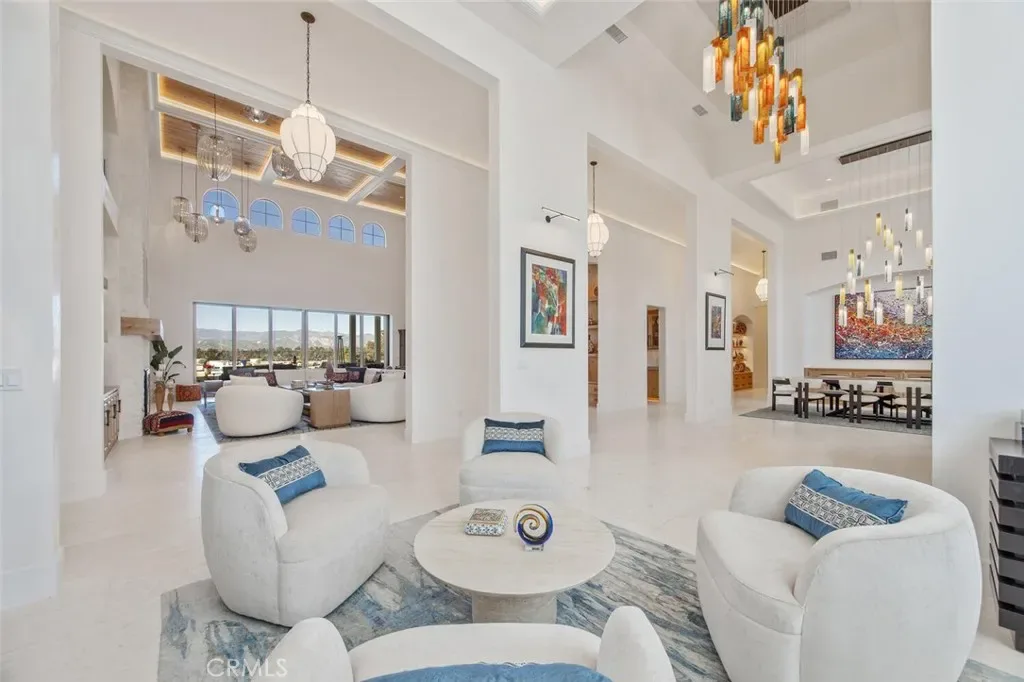 A dramatic foyer introduces Turkish white limestone floors, hand-applied Venetian plaster walls, and a sculptural multi-tier chandelier. Beyond, the great room soars to 26-foot ceilings with a limestone fireplace and expansive 20-foot disappearing nano doors that dissolve the boundary between interior and exterior living.