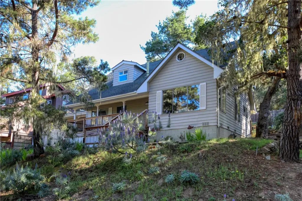 On a road less traveled you will find this classic 4 bed, 2 bath home on a triple lot in the village of Cambria Pines by the Sea. This Lodge Hill home offers a big front porch for enjoying the forest setting. From the entry you find spacious living room with picture windows on 2 walls on your right. The eat-in kitchen offers room for huge dining table, and the tall window wall brings in the landscaped back yard, with its seating areas, terraces, fruit trees and raised bed planters. There are also 2 bedrooms and a whimsical bathroom, as well as a mud room/laundry room that leads to the gardens in back. Upstairs you find a generous main bedroom, a 4th bedroom, and a full bath, plus ample storage. It is an easy walk to the 430+ acre Fiscalini Ranch Preserve and its trails to the bluff trail and Moonstone Beach Drive. Neighbors show pride of ownership and it is so quiet here, and make this a great place to land in Cambria. The Central Coast has so much to offer, like Big Sur, wine country, secluded beaches, fresh fish in Morro Bay and all the culture San Luis Obispo has to offer. Come see for yourself!
