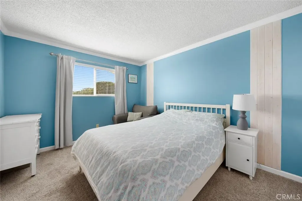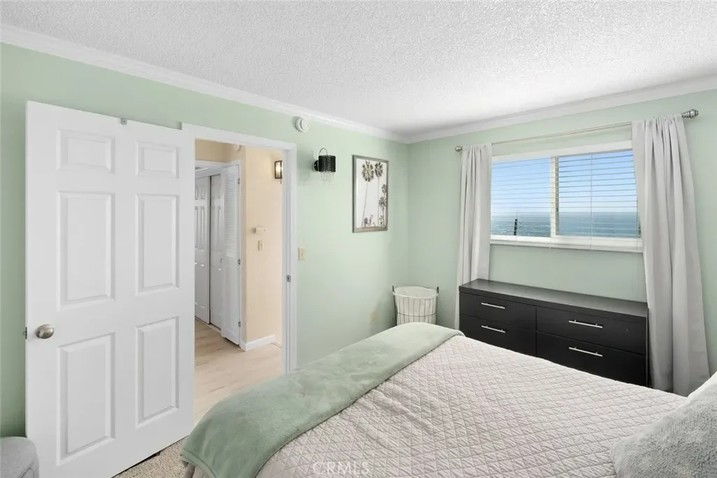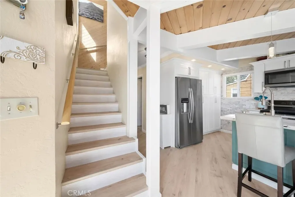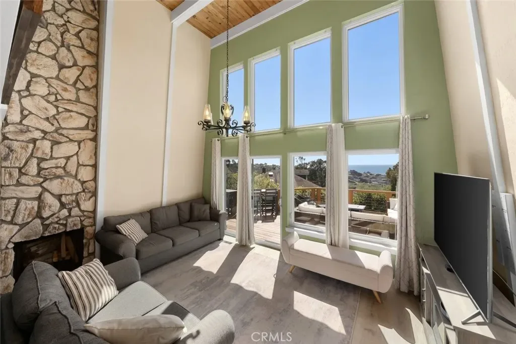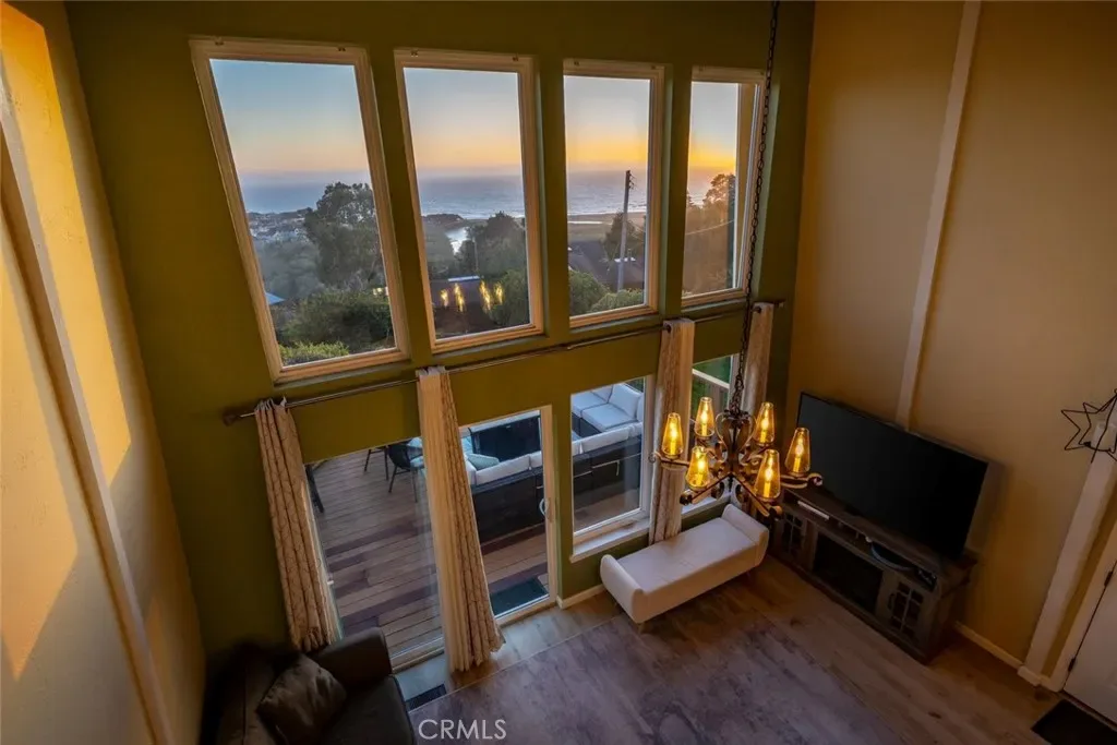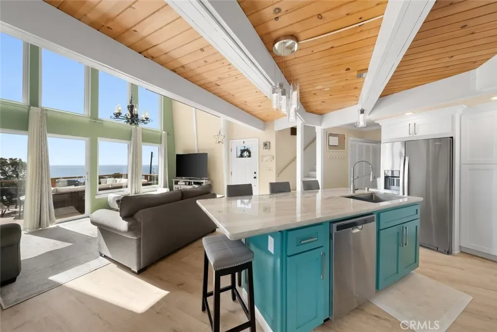 The dramatic living room—with nearly 18-foot ceilings, a cozy fireplace, and expansive windows—opens to a large view deck that truly extends the living space. It’s an ideal setting for morning coffee, outdoor dining, or simply taking in the whitewater views of Moonstone Beach and the Santa Rosa Creek estuary.