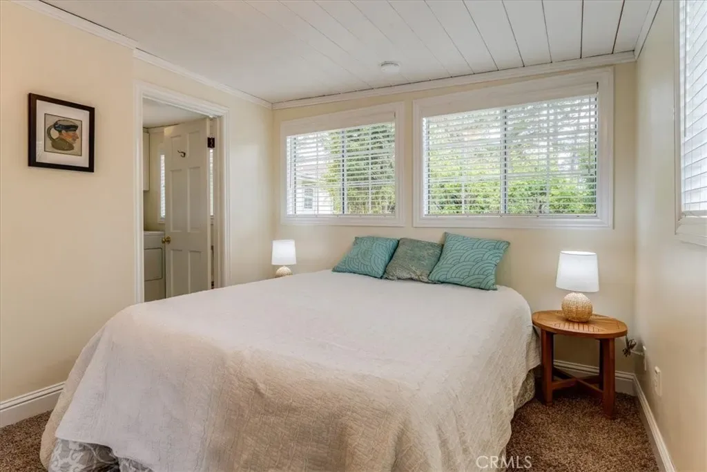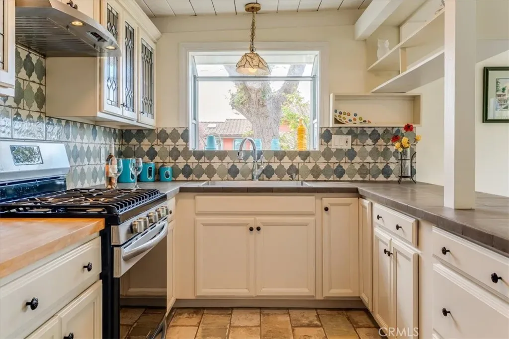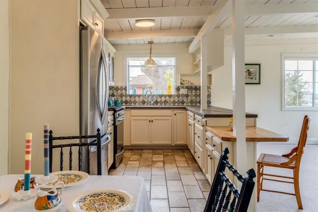 This Absolutely Charming, single level, Happy Hill home is full of desirable features. First and foremost, it is a single level home with an ocean view from both the interior and the front garden! Secondly, it has a vacation rental license plus there is a main house and a guest cottage. The main house has an open floor plan with a 31,000 BTU gas free standing fireplace in one corner of the living area, and an ocean view in the other. A charming, tiled kitchen has tile backsplashes, stained glass front upper cabinets, and both tile and butcher block counters. A garden window with a peek of ocean view is visible right from the kitchen sink. The dining nook connects the kitchen and living room. Extra storage is found in the large pantry at the end of the hall. There are three bedrooms, a bathroom and a half, and interior laundry room. One of the bedrooms has a sliding glass door to the patio and gardens, another has an exterior door to the side yard. Charming tile is found throughout the home. One bathroom has a solar tube for extra sunlight, there is a tankless hot water heater, and the home has Solar for zero or next to nothing electricity bills. The exterior of the property has been lovingly curated. There are cement patios and meandering brick paths between the well-maintained gardens. There are many places to sit and enjoy the birds, a glass of wine, or a cup of coffee in the morning. There is even an outdoor bathtub! The guest cottage has a gas fireplace, tiled bathroom, and large guest kitchen with a door to the back patio. There is also a heat pump mini split. This incredible location is a short jaunt to town or Moonstone Beach.