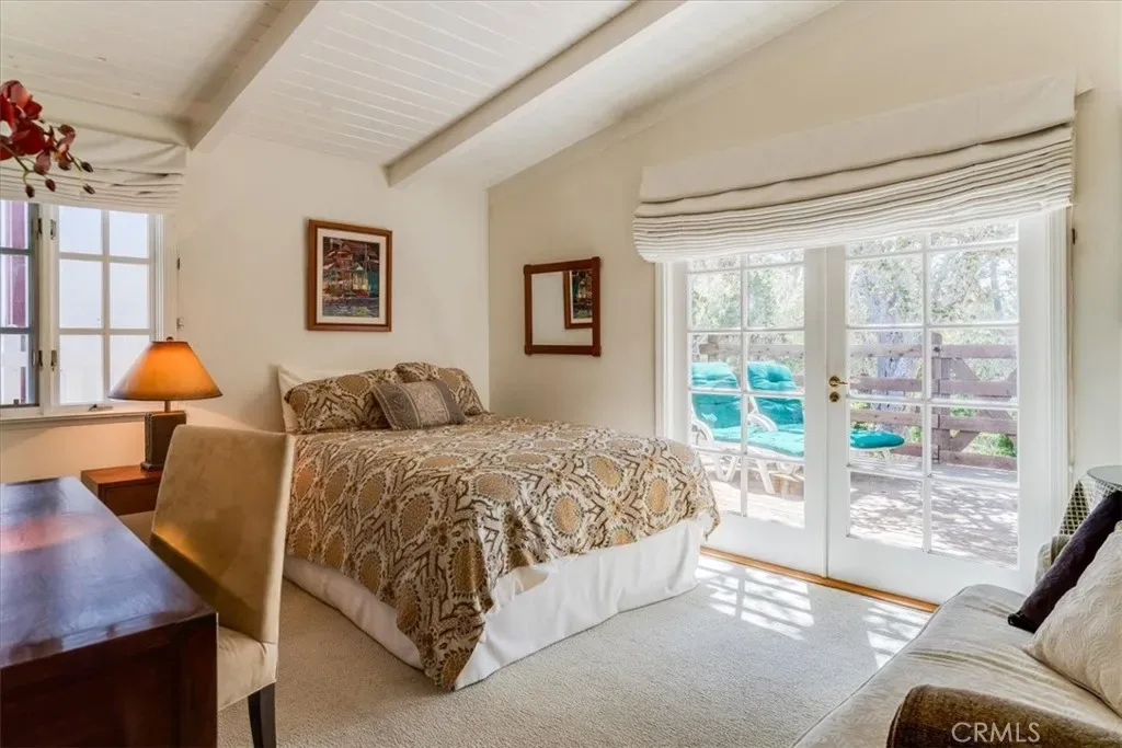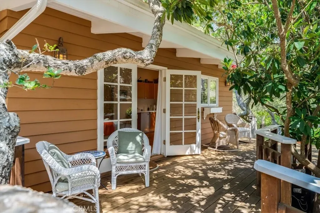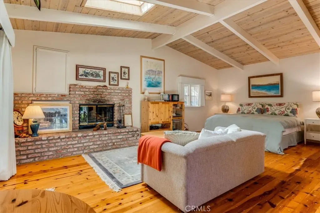 The main home features 3 bedrooms and 2 bathrooms, with an open-concept layout that seamlessly connects the kitchen, living, and dining areas into an inviting great room. Soaring ceilings with exposed beams and a skylight fill the space with natural light, all centered around a cozy wood-burning fireplace. Two sets of French doors open to the front patio, while each bedroom features its own French doors leading to an expansive back deck—creating a seamless connection between the interior and the surrounding landscape.