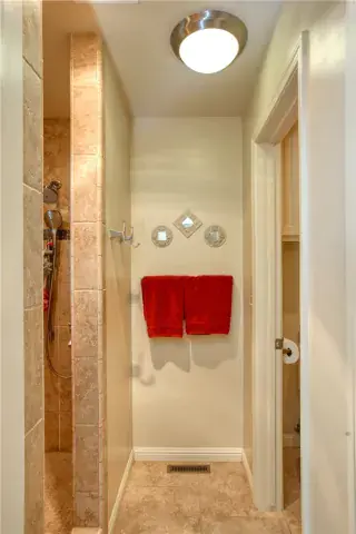 The en suite bathroom has a double vanity and a walk-in shower. Down the hall is the guest bedroom with ocean views and a full bathroom.