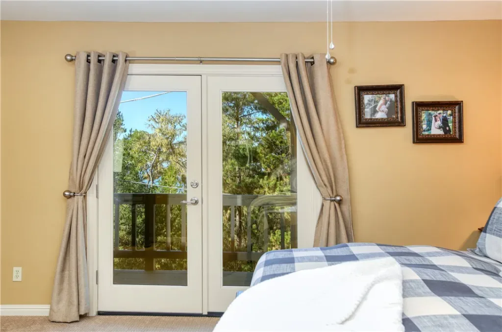 The en suite bathroom has a double vanity and a walk-in shower. Down the hall is the guest bedroom with ocean views and a full bathroom.