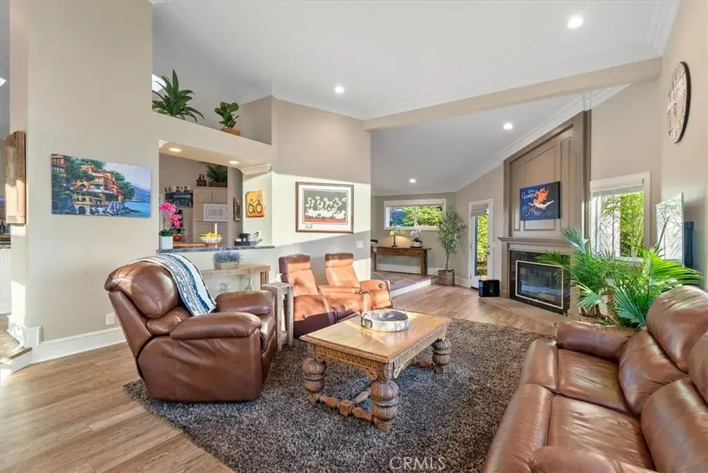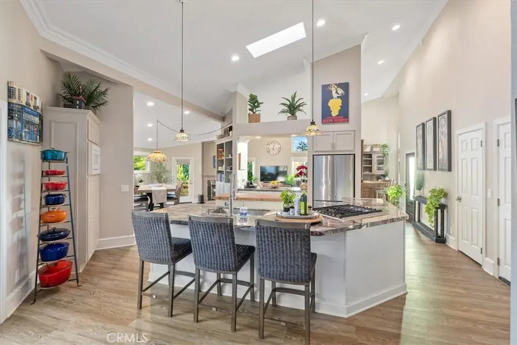 The great room welcomes you with soaring ceilings and panoramic glass rising nearly 12 feet, framing wooded coastal views and filling the space with natural light. A cozy fireplace sets the tone for gatherings, while crown molding adds refinement throughout. At the heart of the home is an expansive open-concept “working kitchen,” newly equipped with custom cabinetry, dual fuel range, and appliances selected for the owner, a classically trained chef. Skylights illuminate hand-selected Blue Tempest quartzite counters, generous prep areas, and custom Boos Block workstations. A front-row seating bar invites friends and family to gather while meals are prepared, and French doors extend to the courtyard lounge—perfect for entertaining and outdoor cooking.