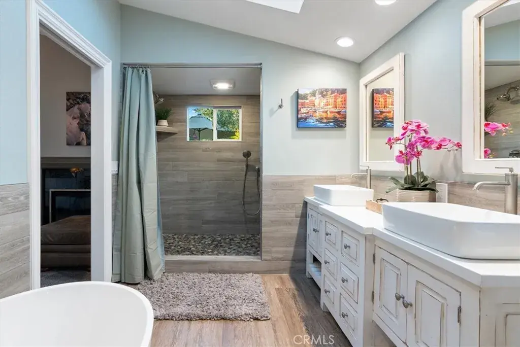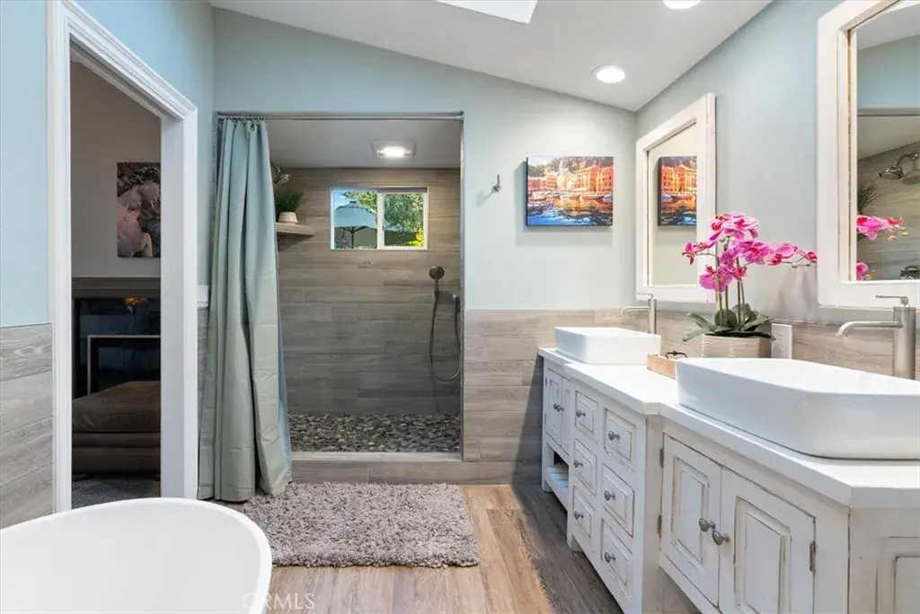 The primary suite offers elevated ceilings, its own fireplace, and serene wooded views. The spa-inspired bath includes a custom shower with multiple Hansgrohe showerheads, a soaking tub, and a dual sink vanity handcrafted from reclaimed wood. French doors open to the private courtyard deck, where a swim spa provides the ultimate space to relax. Two additional bedrooms and a bonus room/office add flexibility for family, guests, or work needs.