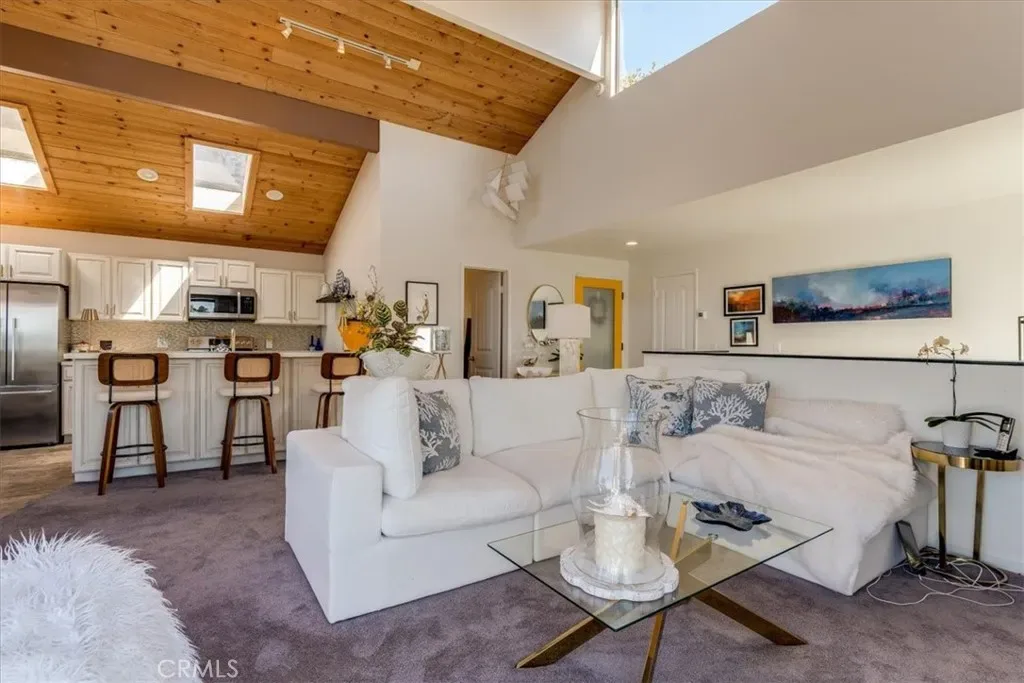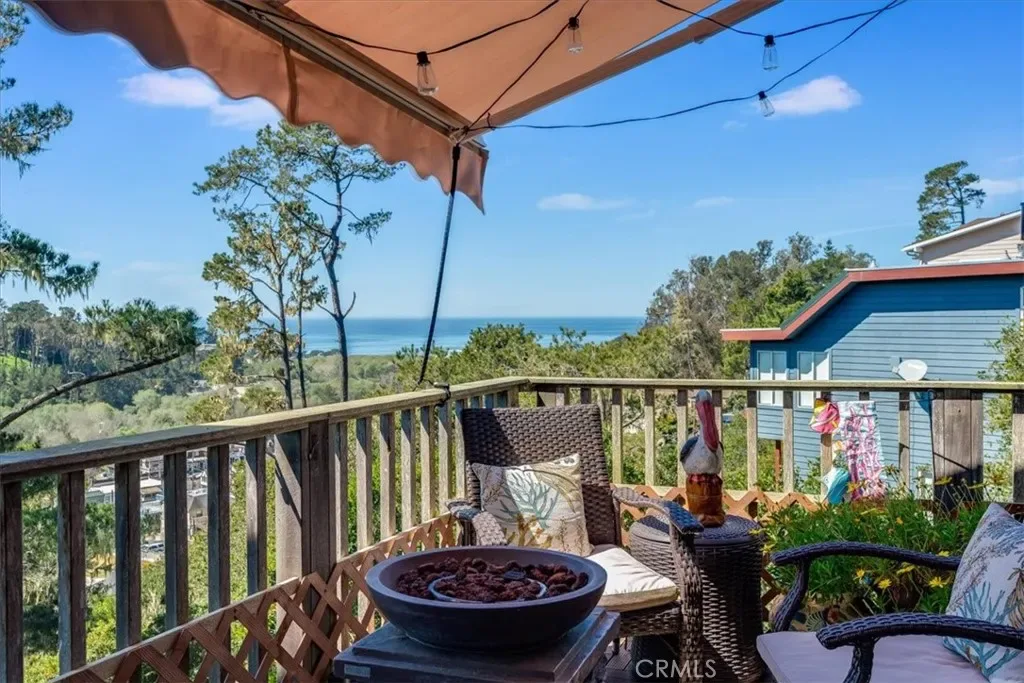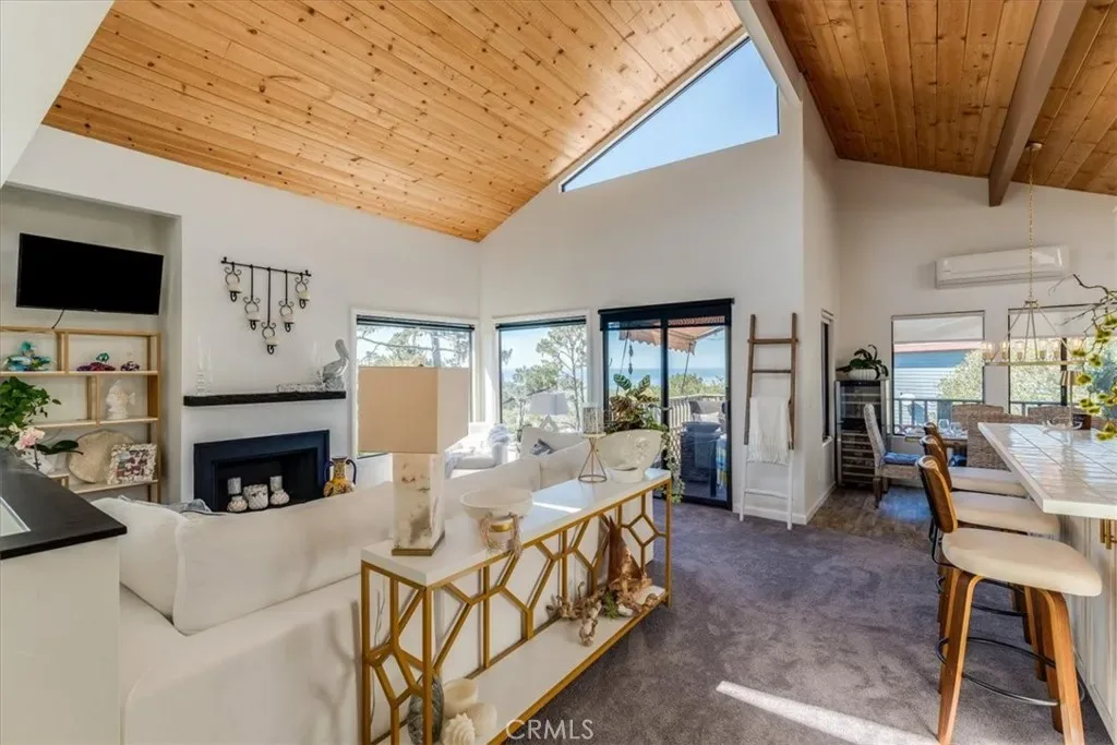 Fantastic White Water Ocean Views at this updated contemporary stylish home. Custom details throughout this 2 bedroom, 1.5 bath home on a a double merged lot. Upstairs features an open concept living, dining, and kitchen area, a half bath, and a deck. A cozy fireplace enhances your sunset watching, while the deck offers stunning views of the ocean, white water, and surrounding trees. The vaulted ceiling is adorned with decorative clerestory windows, wood detailing, and skylights that keep the space light and bright.
