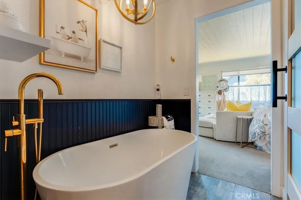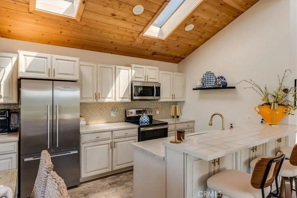 The kitchen was tastefully updated with quartz countertops, custom soft-close cabinetry, new appliances, modern lighting, fixtures, and a slate tile backsplash. The tile flooring has a rustic wood look—easy to clean and perfect for beachside living. Additional updates include newer carpet, window blinds, drywall, and paint, giving this contemporary home standout appeal.