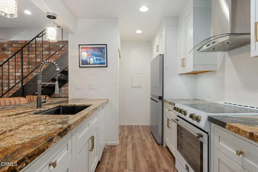 Just steps from the sand in this beautifully upgraded two bedroom, 1-bath townhome! The stunning kitchen features real granite countertops with a large island, full soft-close cabinetry, built-in fridge and matching stove, a spacious hutch with wine storage, and elegant recessed lighting with a chandelier–far beyond typical builder finishes. The home offers easy-care wood-look flooring, stained wood stairs (no carpet), and recessed LED lighting throughout. Upstairs, the primary suite includes a generous walk-in closet, while the secondary bedroom offers mirrored closet doors. The bathroom has a custom vanity with a handmade bronze vessel sink and a Kohler comfort-height toilet. Additional highlights include dual-pane windows, a private one-car garage with abundant storage, and driveway