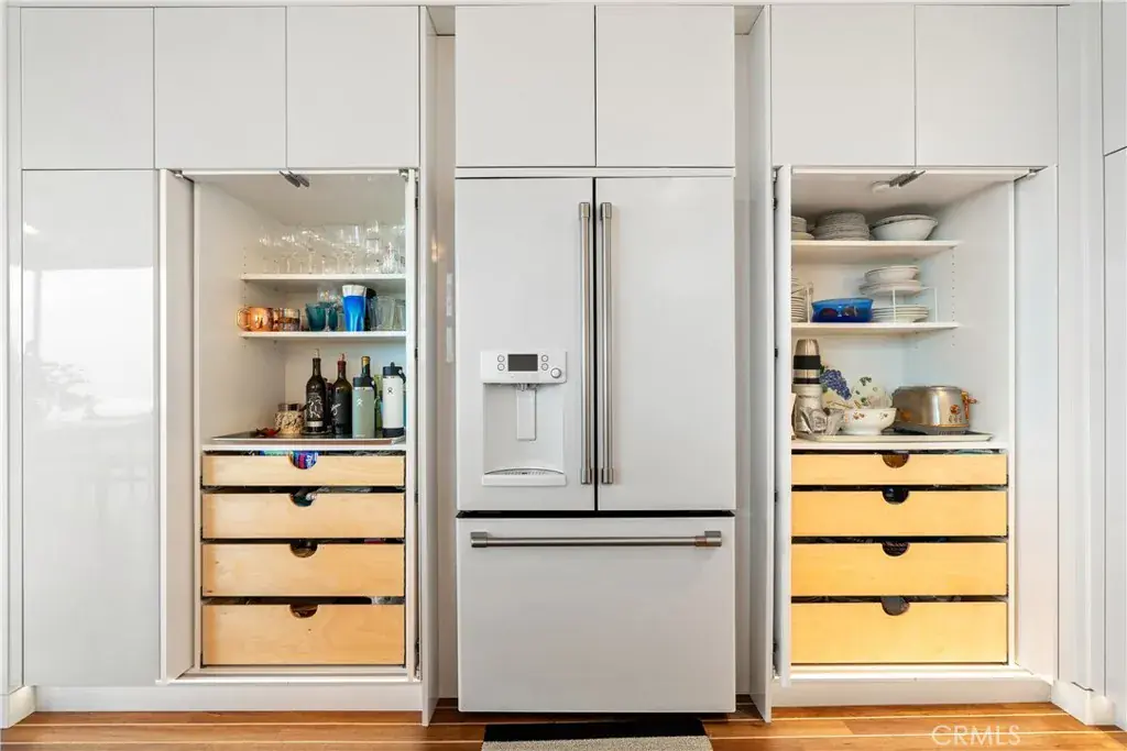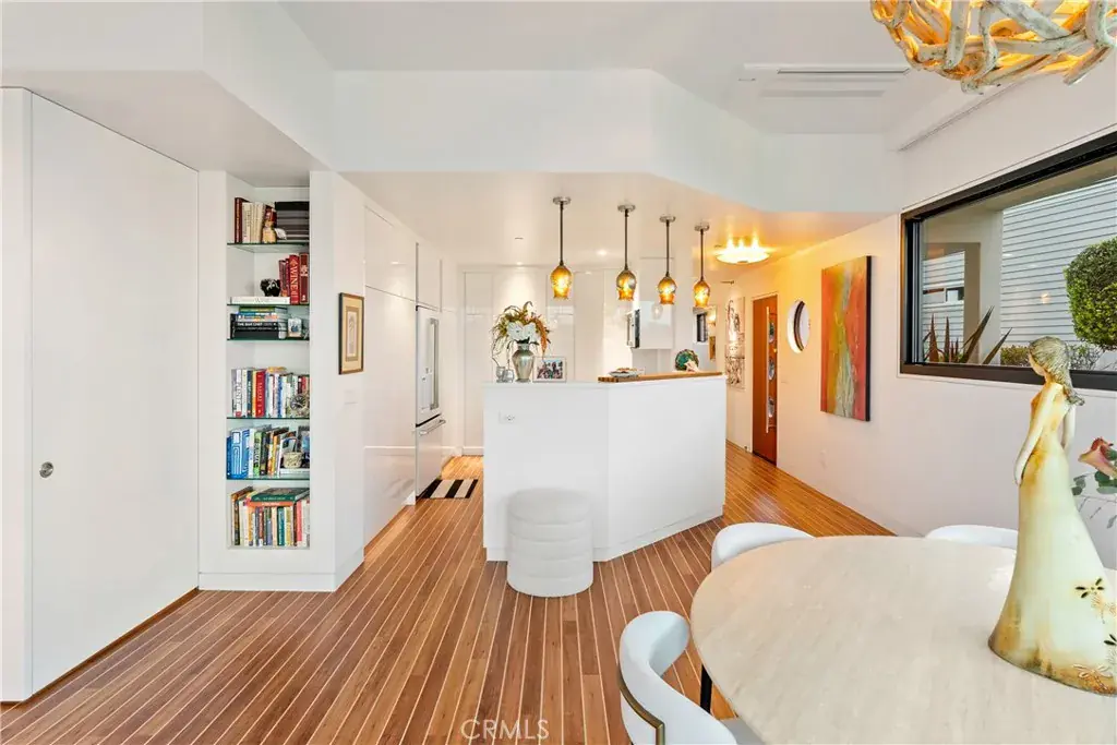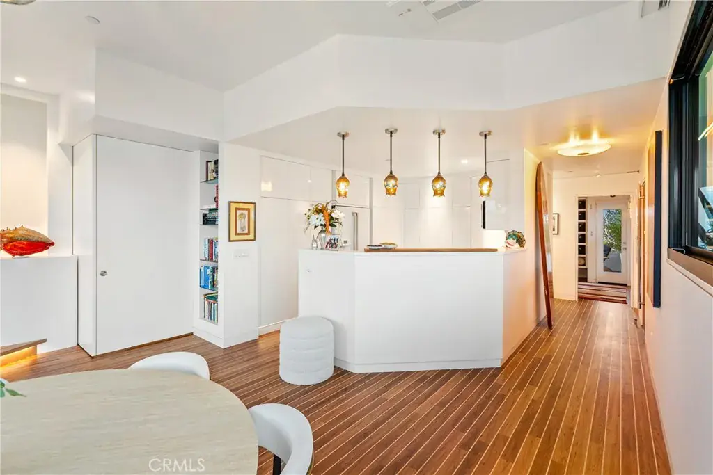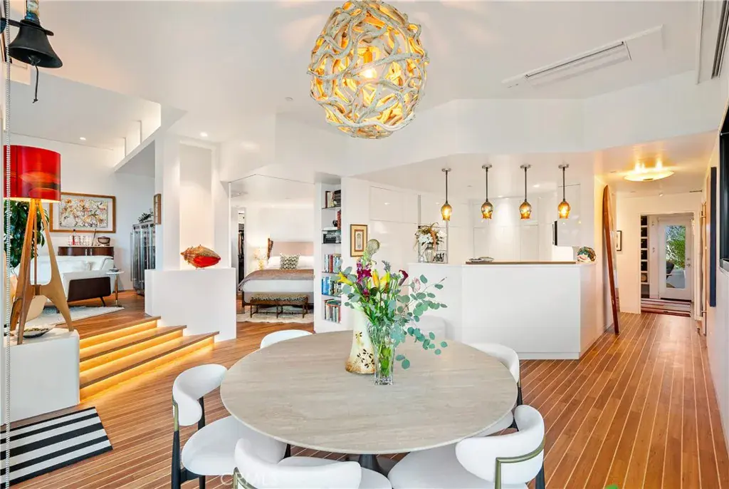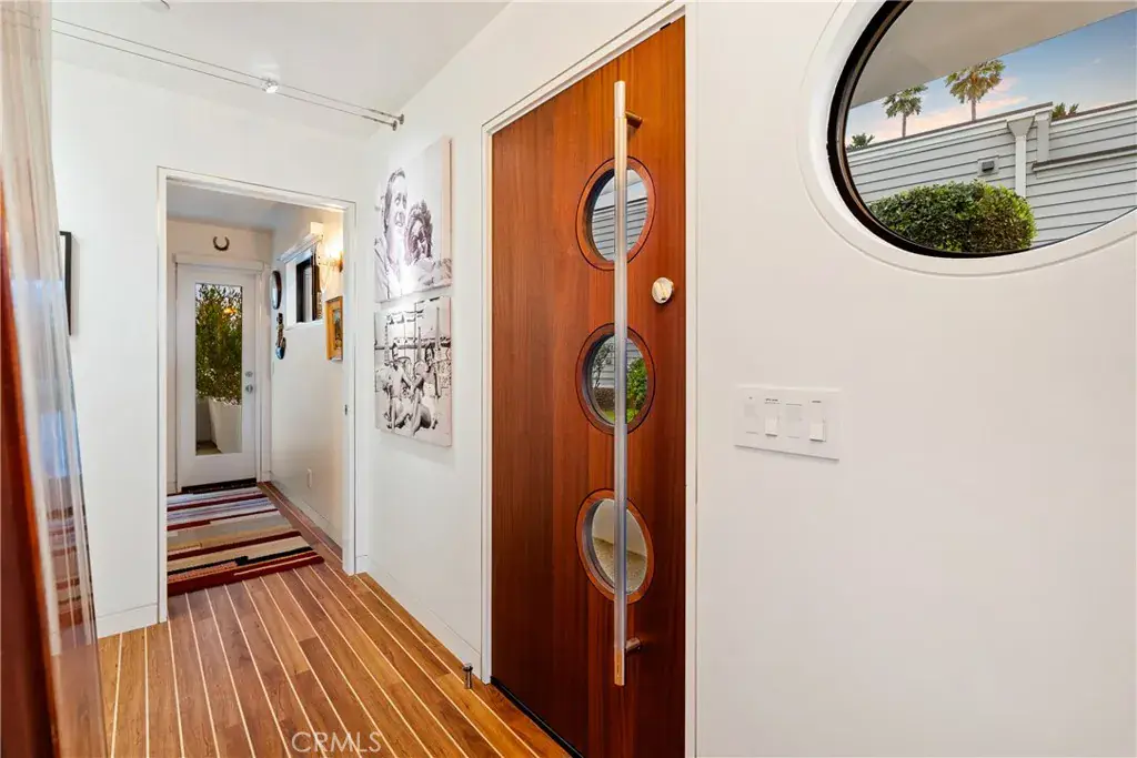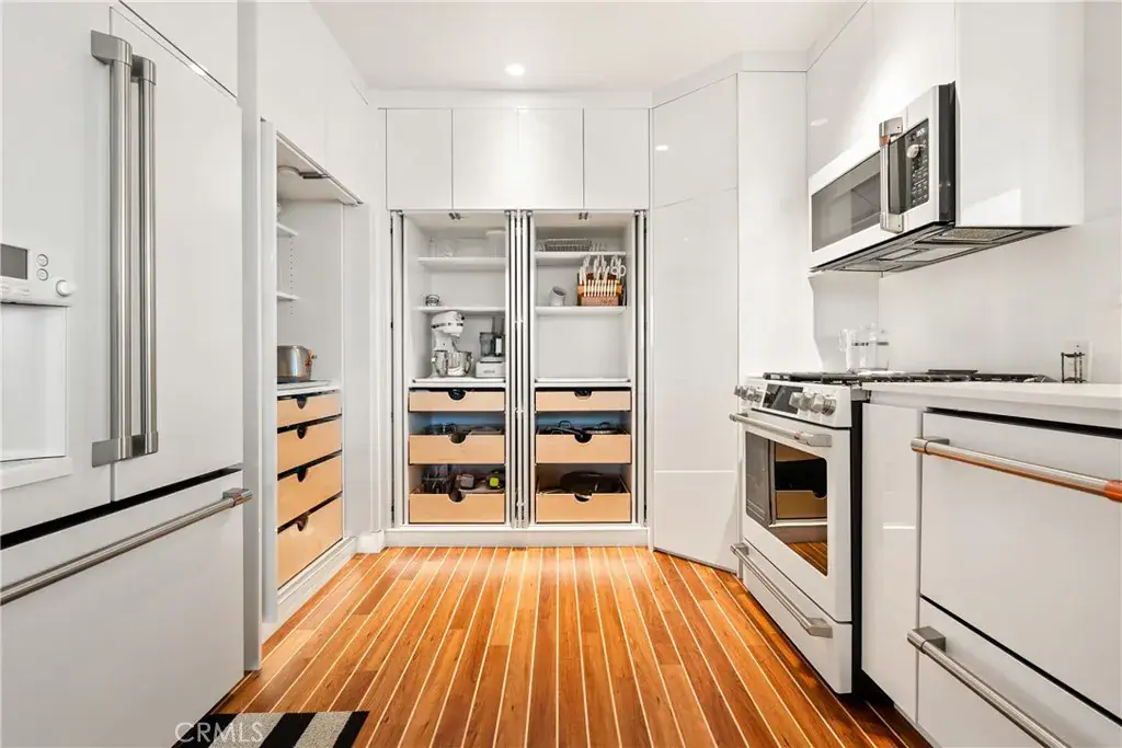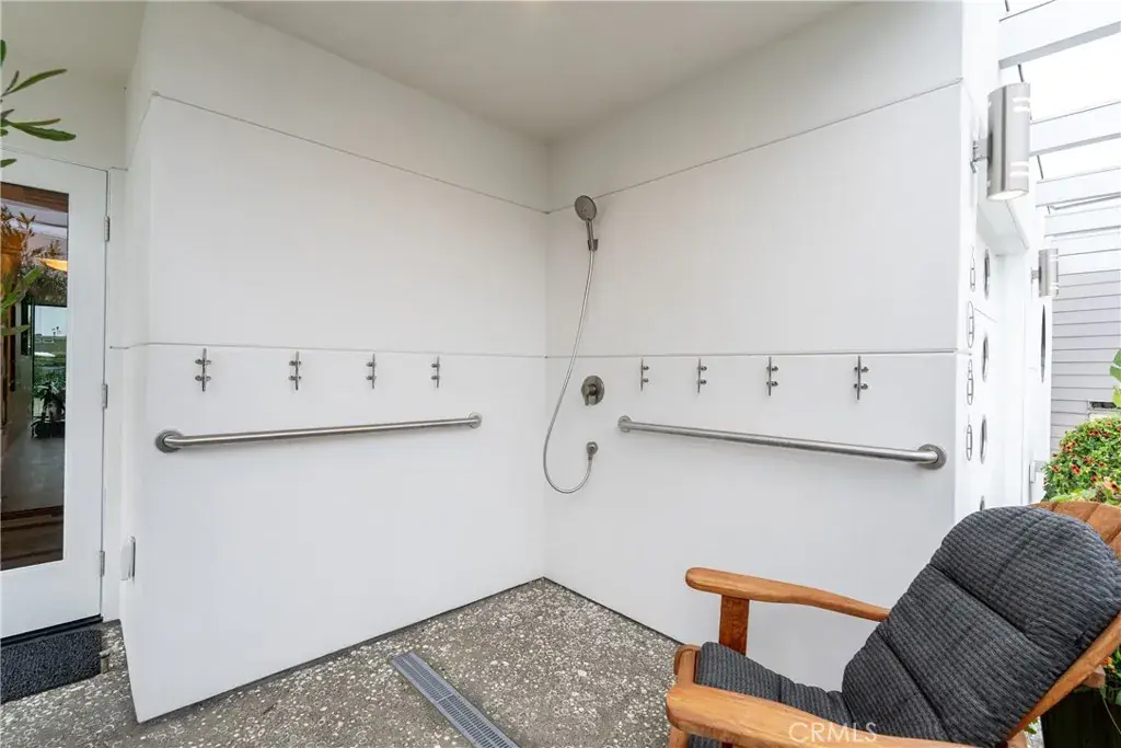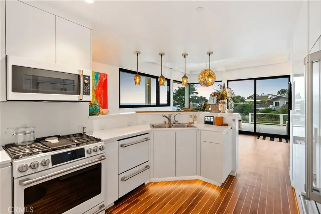 You are greeted by a front courtyard patio with an outdoor shower, storage for surfboards and wetsuits, and a comfortable seating area. A custom mahogany front door opens to a light-filled open floor plan and a stylish kitchen featuring high-gloss, push-to-open cabinetry and Café matte white appliances with bronze accents. Durable marine-grade teak and holly yacht-style custom flooring runs throughout, adding a subtle nautical touch with easy maintenance.