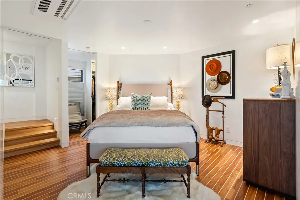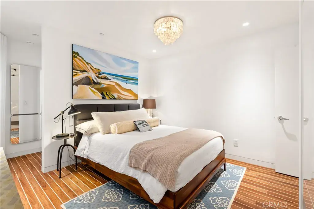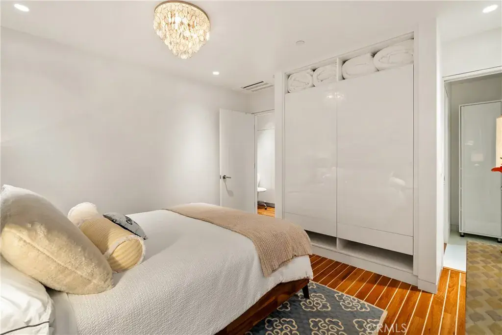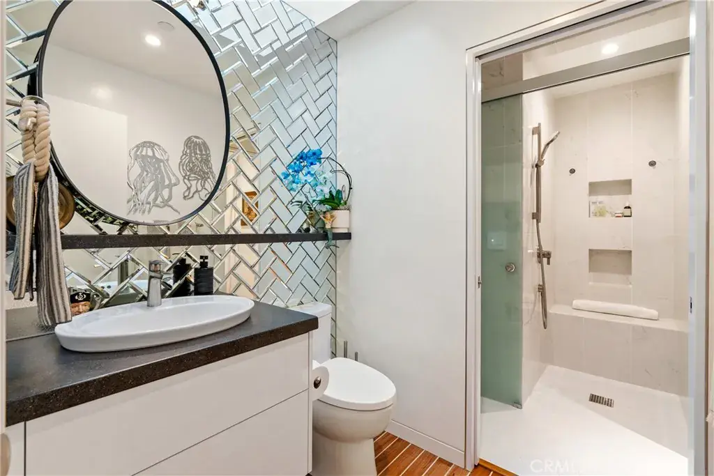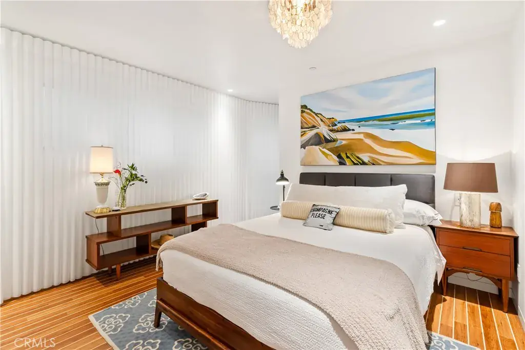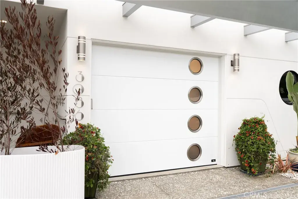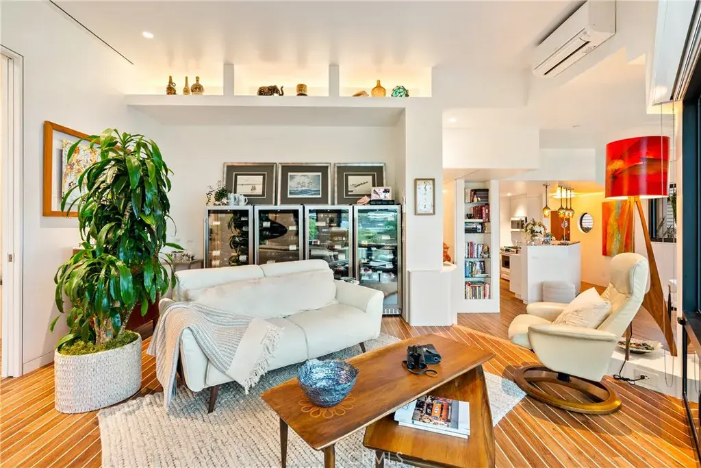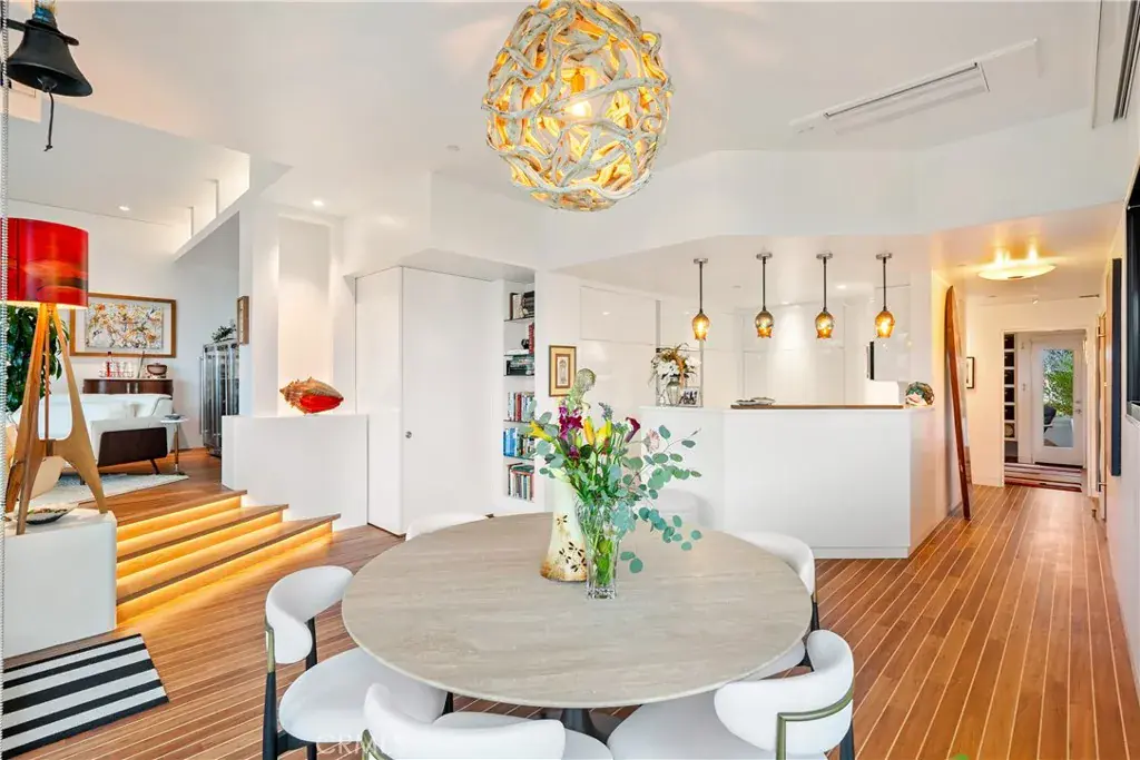 You are greeted by a front courtyard patio with an outdoor shower, storage for surfboards and wetsuits, and a comfortable seating area. A custom mahogany front door opens to a light-filled open floor plan and a stylish kitchen featuring high-gloss, push-to-open cabinetry and Café matte white appliances with bronze accents. Durable marine-grade teak and holly yacht-style custom flooring runs throughout, adding a subtle nautical touch with easy maintenance.