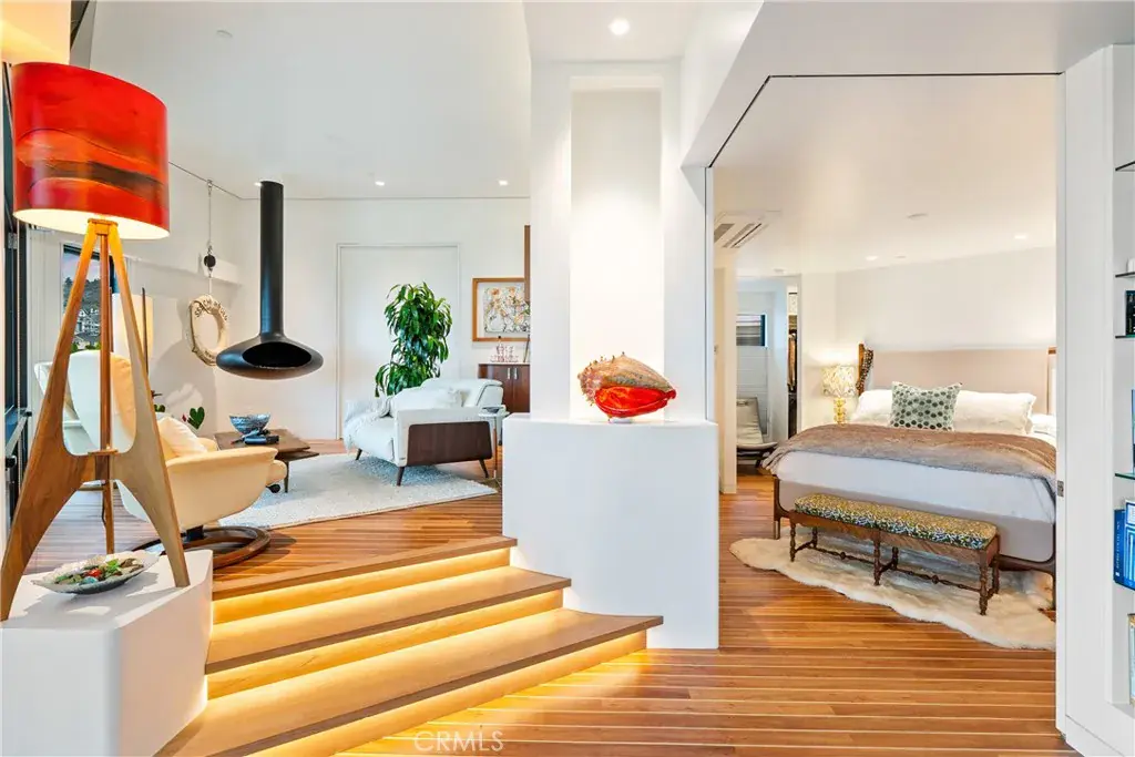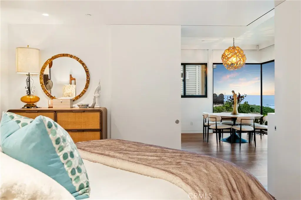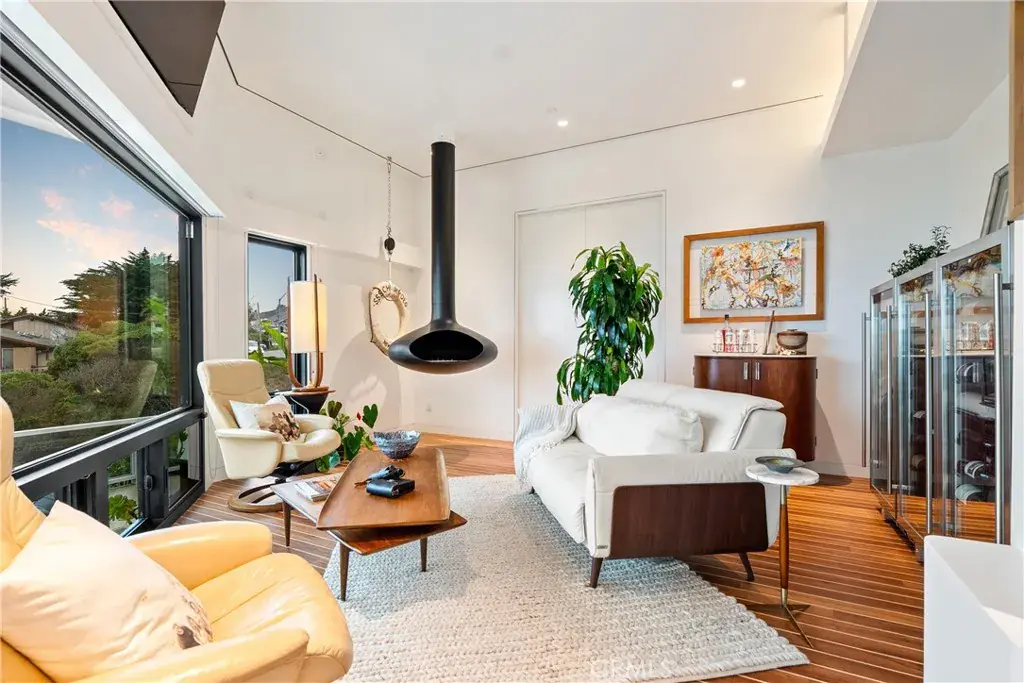The home is centered around its ocean views. Wide doors from the primary bedroom and ensuite bath open fully to take in the ocean from the comfort of your bed or soaking tub. The spa-style bath features matte black counters, a deep soaking tub, minimalist fixtures, a vanity station, in-drawer powered hair appliance storage, and additional built-in drawers. Large ocean-facing windows in the contemporary living area, along with a unique eco-fuel suspended fireplace and layered accent lighting, create a relaxing coastal ambiance.
