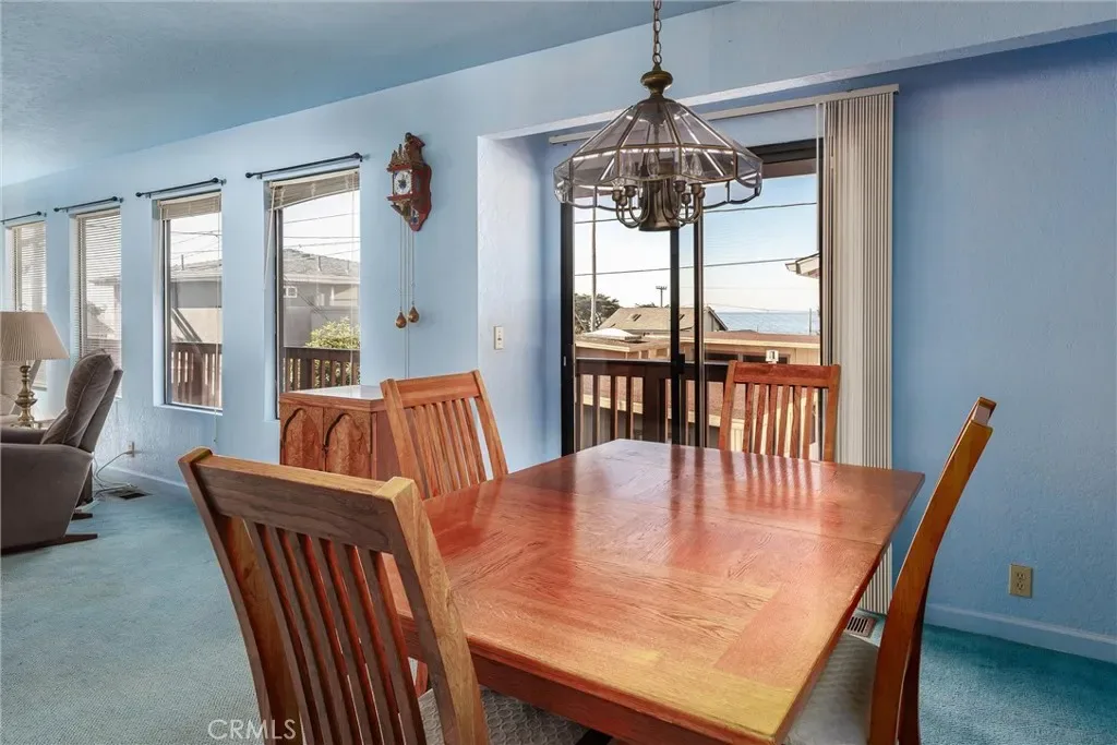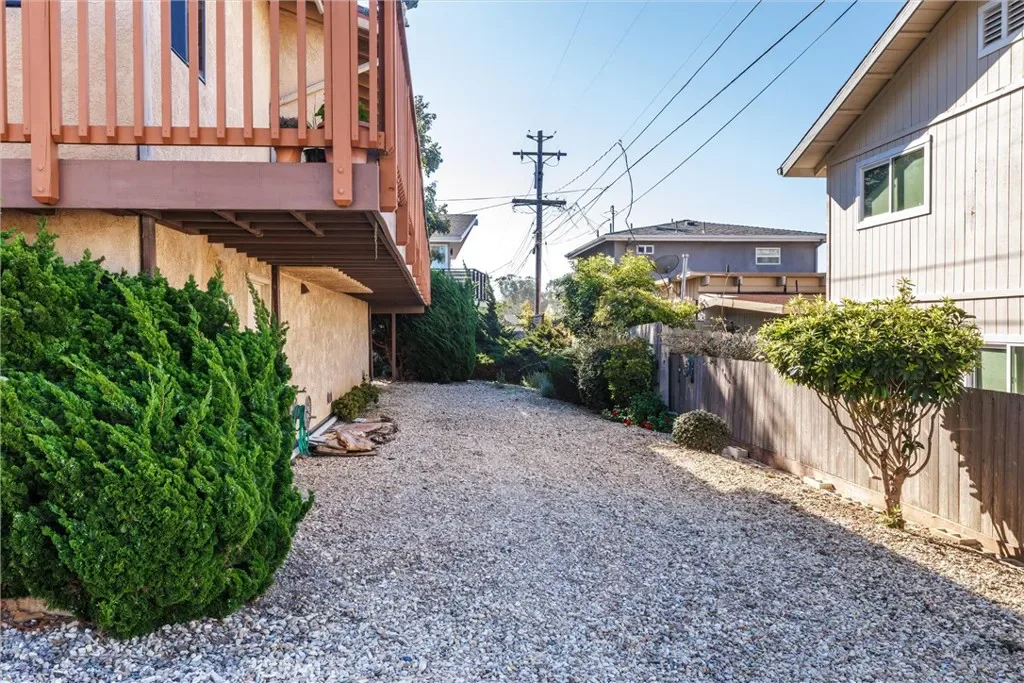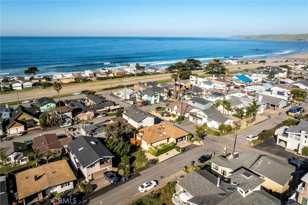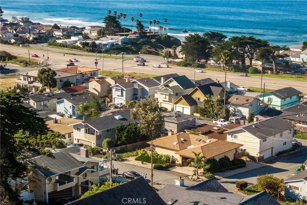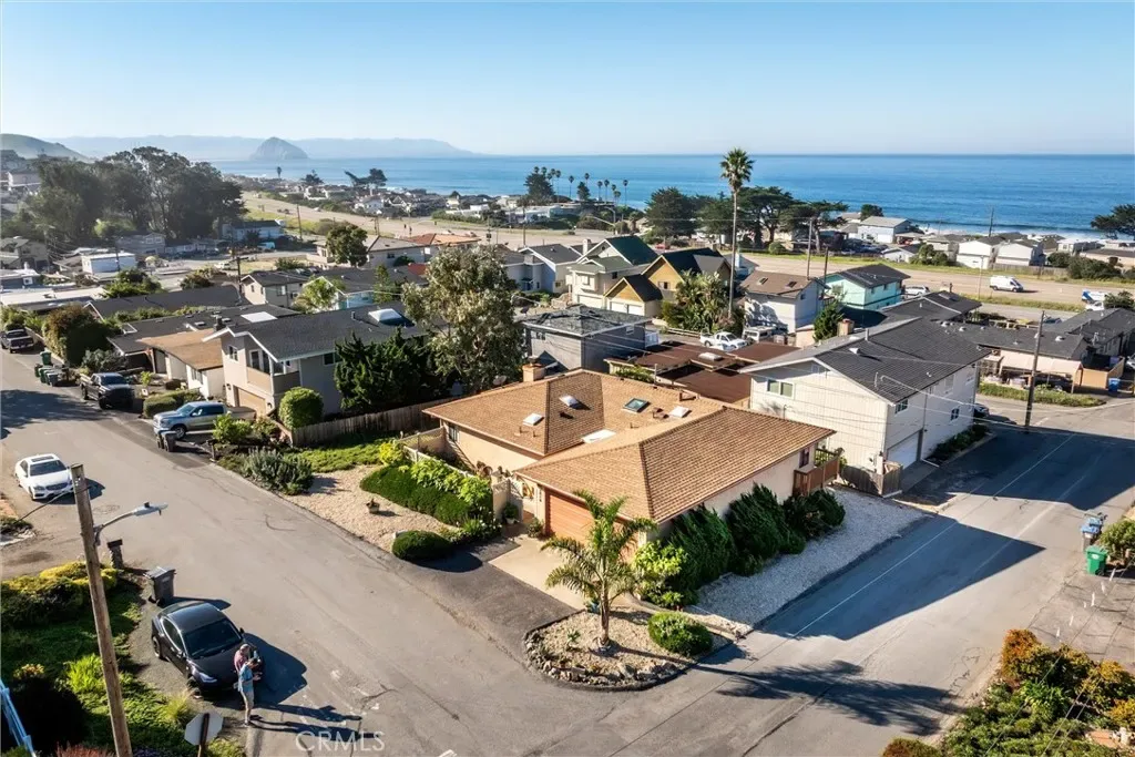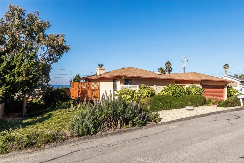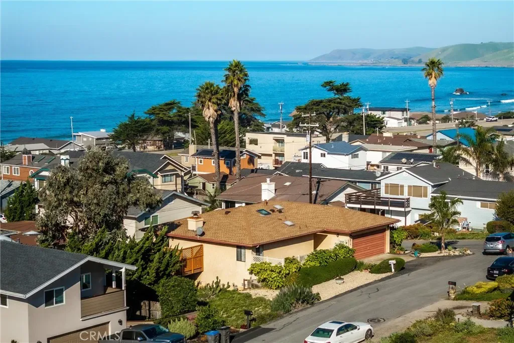 Singular opportunity on a downslope lot of nearly 6,000 sq. ft. with a gentle slope and ocean views. This single-level home offers both hill views and sweeping ocean vistas stretching to Pt. Estero along the north coast. The entry provides access to the two-car garage, a private patio with morning sun, and a spacious great room with ocean views and access to a deck. A dining area and efficient kitchen are nearby, offering ample storage and functionality. The primary suite is situated on the street side and features generous storage, a full bath, and its own ocean-view deck. The guest bedroom has an adjacent bath that also serves the great room. Below the structure, a gravel area provides additional parking, including space for RV parking. The southerly portion of the lot is landscaped and offers exceptional potential with approximately 70 feet of depth, ocean views, and access to the decks above.