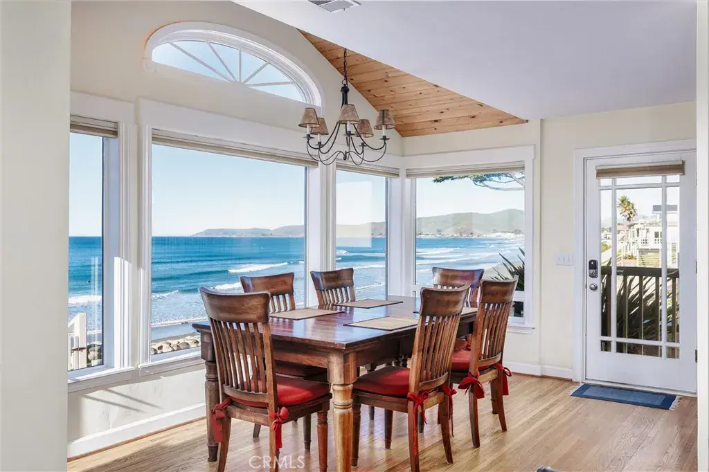 Rare oceanfront offering. This distinctive two-lot parcel comprises approximately 7,400± square feet, with 50 feet of ocean frontage and over 145 feet of depth. Situated closer to the bluff edge than neighboring residences, the property enjoys sweeping point-to-point coastline views and dramatic white-water vistas, enhanced by offshore rock formations. A set of finely crafted private stairs descends through an ice plant–covered bluff to a broad sandy beach below. The property includes a street-side two-car garage with additional storage, along with separate guest quarters, offering flexibility for visitors, extended family, or private accommodations. Beyond the garage is a sheltered interior patio well suited for container gardening, a spa, or outdoor entertaining. The main residence is accessed from the patio and opens into a full-width great room featuring vaulted ceilings, expansive glass, and an open-concept living, dining, and kitchen area. Wood flooring and detailed ceiling insets contribute warmth and architectural interest, while ocean views are enjoyed throughout the primary living spaces. The main living area includes a fireplace, ceiling fan, and a stackable washer/dryer discreetly located in a living room closet. The efficient kitchen is appointed with granite countertops, updated cabinetry, and stainless steel appliances. The dining area is highlighted by an arched window and plank-style ceiling. The main residence offers two bedrooms with ample natural light, including one generously sized to accommodate twin beds, along with a full bathroom featuring a pedestal sink. A wide bluff-top patio extends from the living area and provides direct access to the private beach stairs. This rare oceanfront parcel, combined with private beach access, expansive views, and separate guest quarters, presents a truly unique coastal opportunity