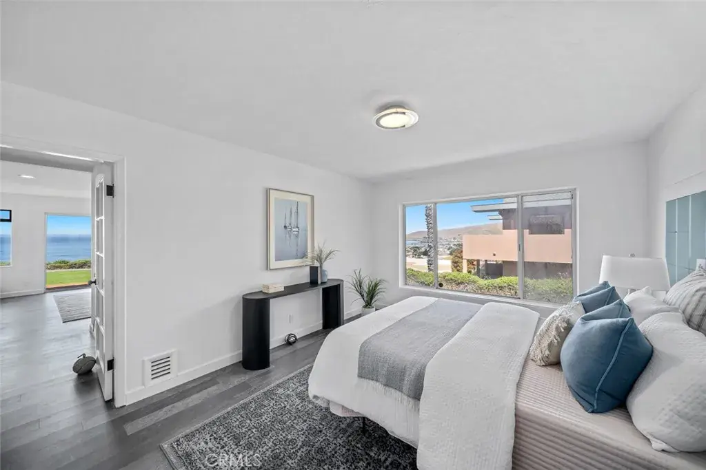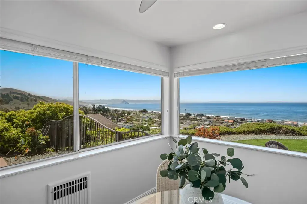 Step inside to a bright and airy layout featuring three bedrooms, three bathrooms, a bonus room, and a home office. The kitchen boasts white cabinetry, marble countertops, a breakfast nook, and picture windows that frame the stunning ocean and Morro Rock views.