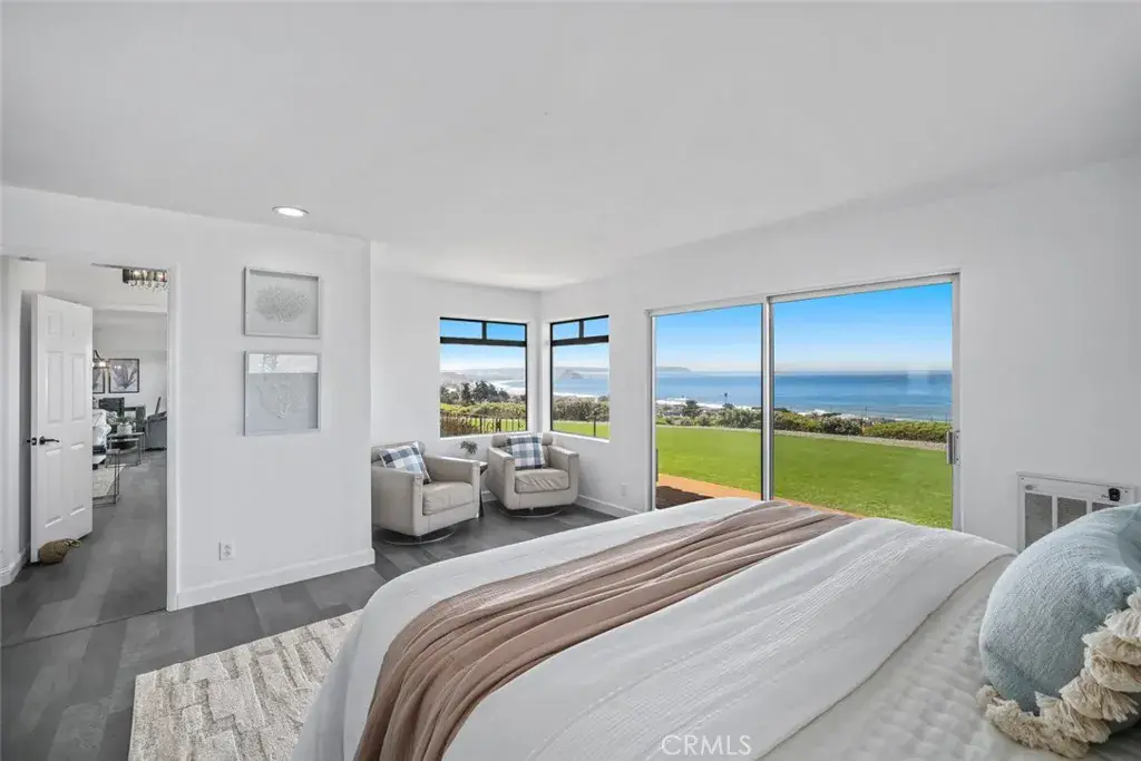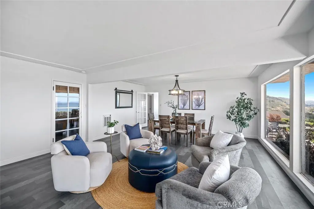 Additional highlights include a dedicated home office with built-ins and ocean views, a generous utility room with pantry storage, a sink, and secondary refrigerator, multiple bathrooms with updated tile and marble finishes, French doors leading to a private backyard, and luxury vinyl plank and tile flooring throughout. This is a rare opportunity to own a one-of-a-kind property with unparalleled views, generous space, and incredible potential, all just minutes from downtown Cayucos and the beach.