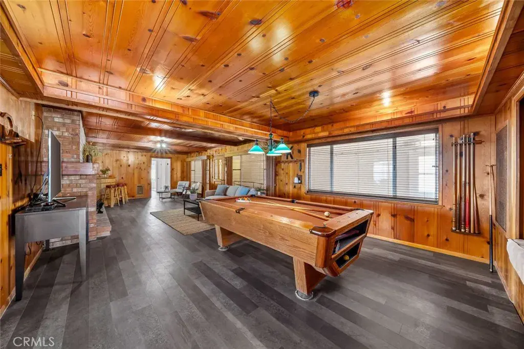 Relax and unwind in the elegant living and dining areas, both showcasing expansive coastal vistas and a cozy wood-burning fireplace. The bonus room adds an element of fun with a bar, pool table, fireplace, and built-in bed nook.