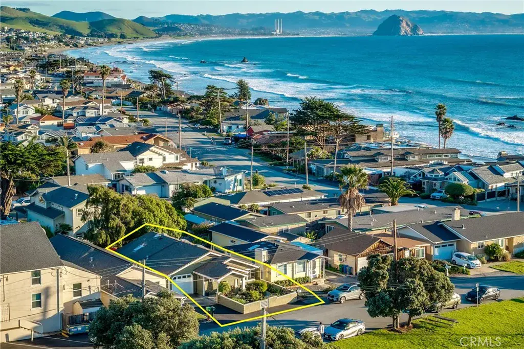 Prime Spot for spacious ocean view residence located across from 3rd Street Park with its expanse of grass, lots of parking and fine ocean views. This stylish single level had a complete rebuild / remodel in 2000. The exterior features white pillars and shake siding with an inviting front portico and courtyard. The courtyard fence creates an extension of the house with matching shakes. Inside is a spacious great room with volume ceilings, open beams and big window areas. A striking fireplace accents the area. Kitchen has quality appliances, custom cabinets with self-close drawers and granite counters. The second full bath has a colorful sink and drawer pulls with tub/shower enclosure. The primary and guest bedrooms have open beams, ceiling fan and open up to the spacious backyard. The lovely spacious back yard is south facing and boasts EZ care landscaping, mature trees, hardscape and wooden decking giving it a private sanctuary atmosphere. The primary bath has a corner shower and jetted tub with a backyard view. Singular location for this single level view residence with appeal on many levels. See it soon!