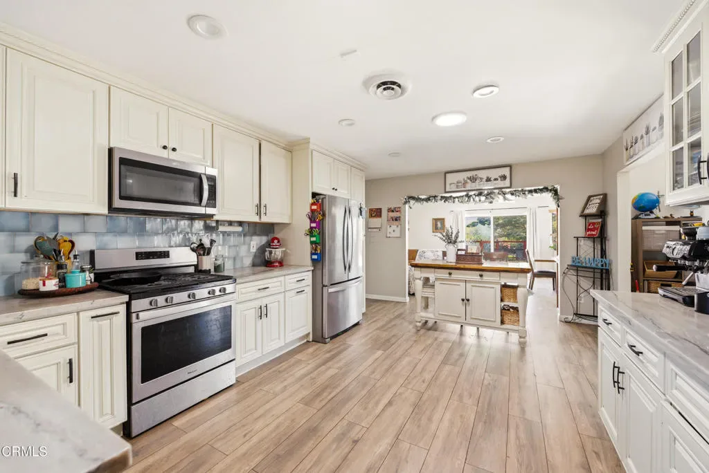 Relaxed Living on a Sprawling 17,000 SF country-like lot.Located near the tranquil Sespe Creek and framed by soft, rolling hill views, this 2,400 sq ft ranch-style residence offers a level of comfort rarely found in the area. Thoughtfully finished upscale finishes and a modern sensibility, the home blends timeless elegance with everyday livability. Upgrades include luxury vinyl floor and vinyl windows.A Distinctive Split-Wing Design – The floorplan unfolds with a sense of privacy and seclusion. – The primary suite occupies its own wing, featuring a beautifully updated bath with quartz surfaces and refined fixtures. – On the opposite side of the home, the family wing offers three bedrooms and two luxuriously remodeled baths, creating an ideal separation of space for guests, children, or multigenerational living.- The chef’s kitchen has been fully remodeled with quartz countertops, custom cabinetry, and upgrades that accent both form and function. – All baths have been thoughtfully redesigned and updated. – A dedicated home-school center or library/office provides a polished, quiet environment for productivity. – The expansive great room flows seamlessly into the formal dining area, creating a thoughtful setting for entertaining or family gatherings.Oh, the Outdoors! The property has an impressive **17,000 sq ft lot:- Space for lush gardens, outdoor living areas, or a future second dwelling unit. – Views of the surrounding hills enhance the sense of privacy and natural beauty. – The proximity to Sespe Creek adds a peaceful, almost retreat-like ambiance.Owners have found their next home and will segue from Island View with wonderful memories.