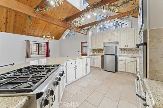 The property includes a spacious 700-square-foot garage and a cement driveway, ensuring ample parking. Inside, the main house boasts expansive living and dining areas highlighted by a striking river rock fireplace and vaulted wood ceilings. The dining area is complemented by a long counter with a separate cooktop and breakfast bar, while the kitchen features stainless steel appliances, including a stove, range, dishwasher, and microwave.