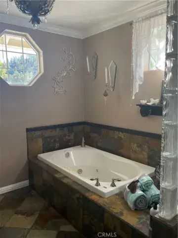 The upper level is a spacious, carpeted primary suite, with a beautiful thermostat controlled gas fireplace, and french doors that open to a small balcony, that is perfect for sipping your morning coffee. The bathroom is an oasis, with gorgeous slate tile throughout, a separate jetted tub and shower, and glass block. The slate shower has multiple shower heads for a luxurious spa-like experience.