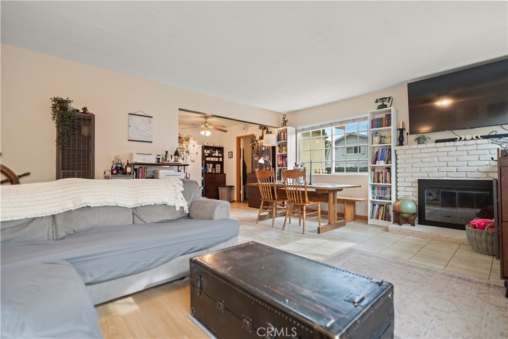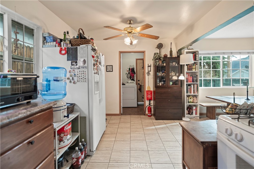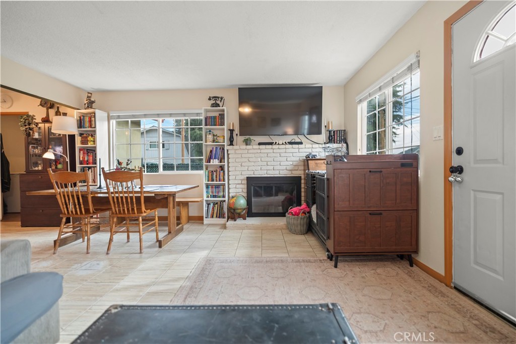 The spacious kitchen offers warm wood cabinetry, updated countertops, and ceramic tile flooring, flowing directly into the living space to create a bright and welcoming atmosphere. Large windows throughout the home provide abundant natural light while framing tranquil mountain views. The living area feels open and comfortable, enhanced by thoughtful built-in touches and a functional layout.