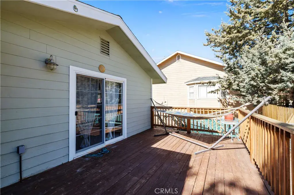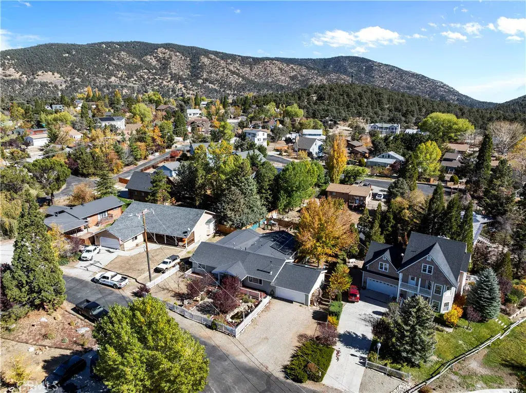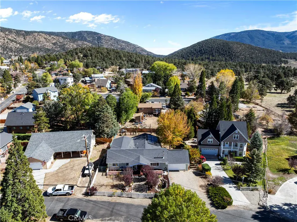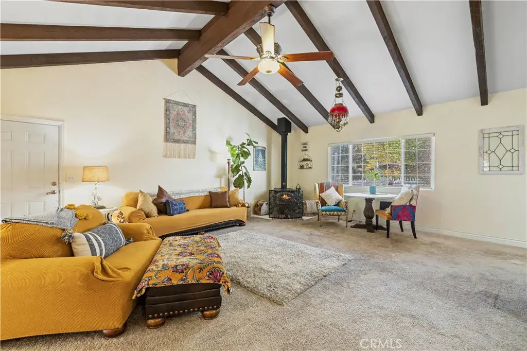 Nestled in Piñon Pines Estates, part of the Frazier Mountain community, this single story charmer greets you first with classic curb appeal from a white picket fence and a tranquil pond with a waterfall. Fully paid off solar keeps energy costs in check. Upon entering, soaring cathedral ceilings with elegant exposed beams set a warm and elevated tone. The kitchen features gleaming granite countertops, soft close cherrywood cabinetry, and solid bamboo floors that continue into a large dining room made for gatherings. The living room centers on a wood burning fireplace beneath extra tall ceilings and custom distressed wood beams for a luxe lodge meets resort vibe. The private primary suite offers an oversized bedroom, a spacious walk in closet, and a spa like bath with a custom travertine shower and a separate jetted tub. Two additional guest rooms are generously sized and served by a large guest bathroom with dual sinks. Outdoors, enjoy all four seasons with a large front porch and a substantial covered entry, plus an expansive wraparound redwood deck at the rear and a fully fenced backyard for effortless entertaining. Practical upgrades include a tankless water heater. A two car garage delivers abundant storage for gear and weekend toys. Set on a quiet cul de sac and just 45 minutes to Santa Clarita, this home feels like a getaway every day.