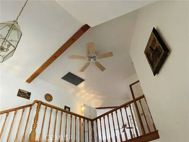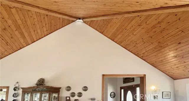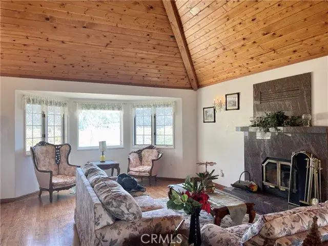 Formal Living Areas: Vaulted wood-beam ceilings, wood floors, fireplace, large dining space, and sunlit sitting/reading area.