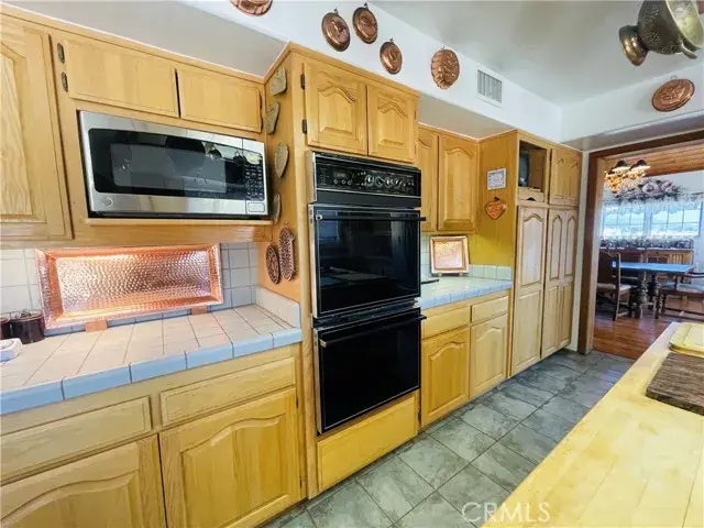 Chef’s Kitchen: Custom wood cabinetry, tile counters, oversized island with butcher block prep station, built-in pantry, double ovens, microwave, trash compactor, pot rack, and large window views — with space to prepare meals for a crowd.