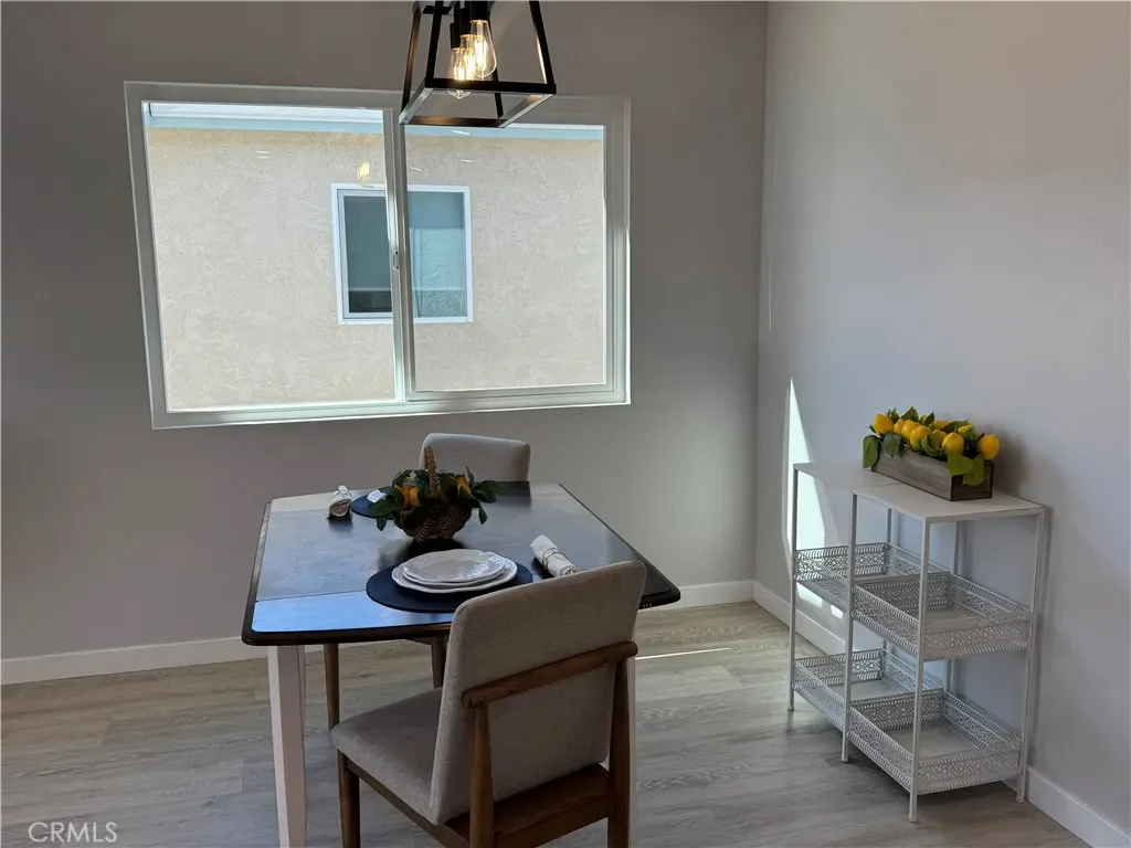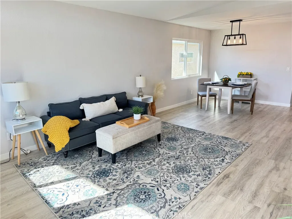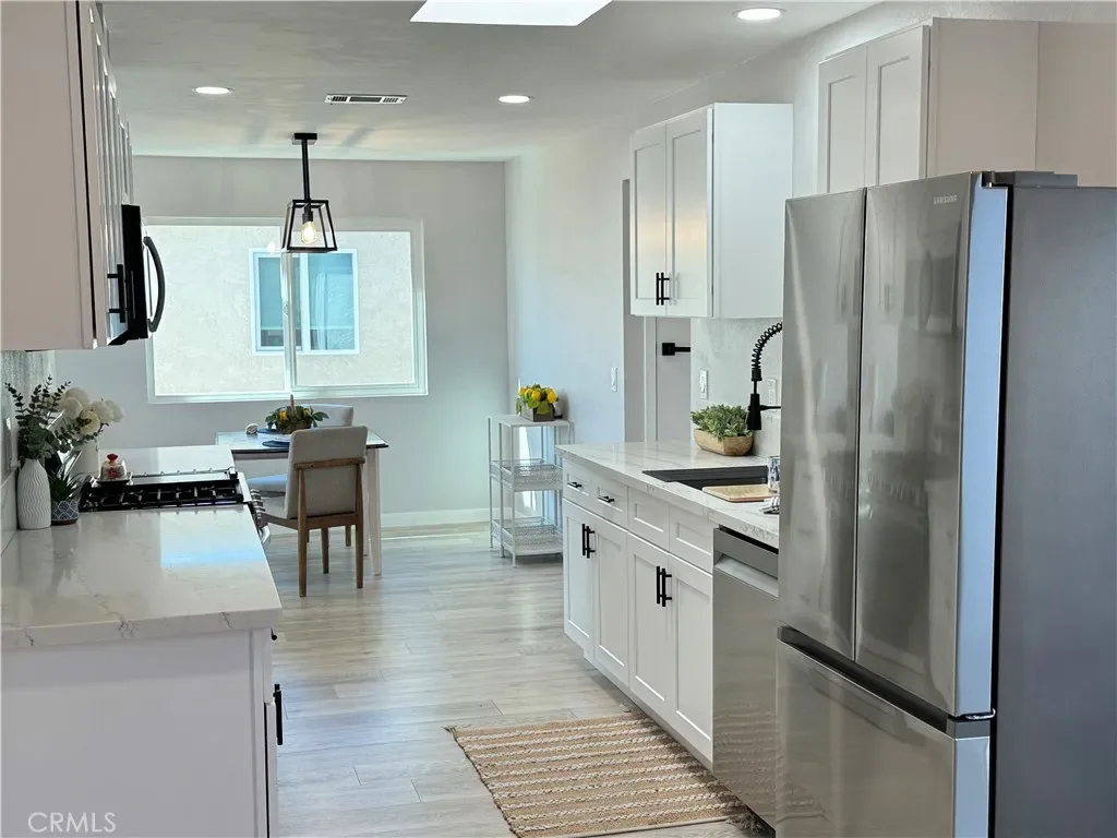 The remodeled kitchen has been thoughtfully redesigned and enhanced by removing the ceiling soffit to create a more open and airy feel. Features include soft-close cabinetry, quartz countertops, deep-set sink, Samsung appliance package (stove, refrigerator, dishwasher, microwave), recessed dimmable lighting, skylight, and a new dining area light fixture. Laminate flooring flows throughout the home, offering durability and easy maintenance.