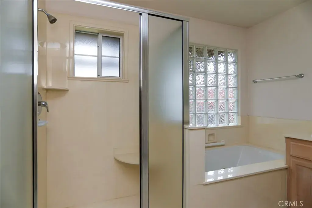 Down the hallway, the primary suite provides a private retreat with a sliding door to the backyard and an en-suite bath complete with a spa-like soaking tub, separate shower, and dual vanities. Also located off the hall are an additional bedroom, a second full bathroom, a conveniently placed laundry area, and two more bedrooms—offering flexibility for family, guests, or workspace needs.