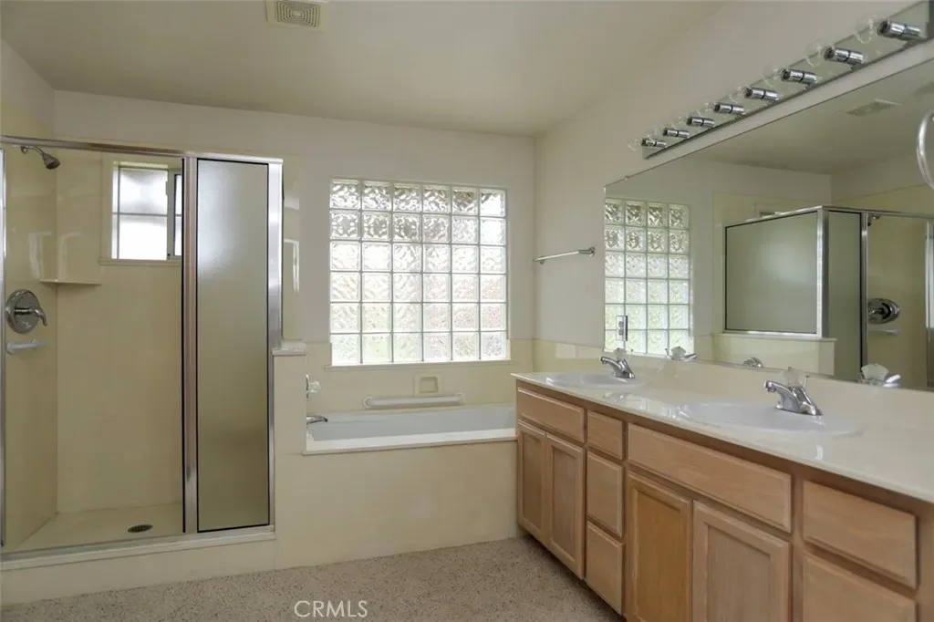 Down the hallway, the primary suite provides a private retreat with a sliding door to the backyard and an en-suite bath complete with a spa-like soaking tub, separate shower, and dual vanities. Also located off the hall are an additional bedroom, a second full bathroom, a conveniently placed laundry area, and two more bedrooms—offering flexibility for family, guests, or workspace needs.