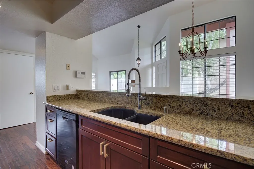 Inside, a skylight brings in natural light to the main living area, where a fireplace and vaulted ceiling enhance the openness of the living room. The kitchen features granite countertops and a functional layout, complemented by new interior and exterior paint, new carpet throughout, a water heater replaced less than a year ago, and a garage workbench for added convenience.