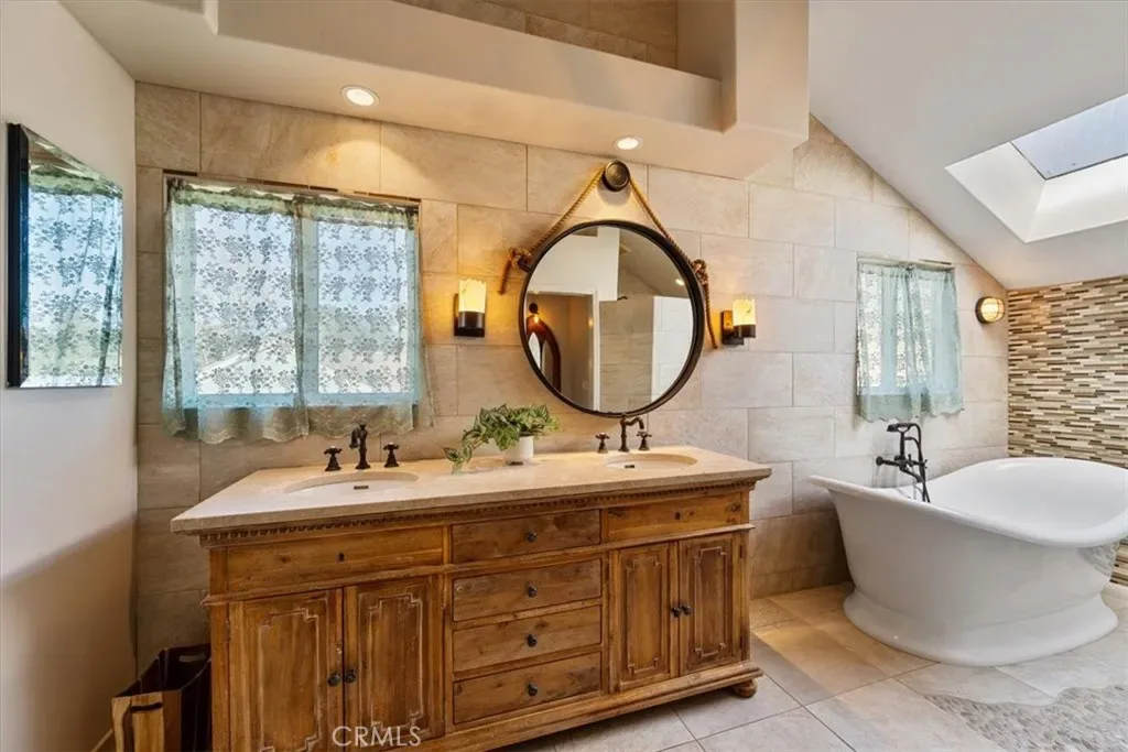 The kitchen is appointed with granite countertops and a charming eat-in dining area complete with built-in bench seating and cleverly designed storage. It flows seamlessly into the inviting family room, highlighted by a cozy fireplace–creating the perfect gathering space for everyday living. Upstairs, the private main ensuite retreat occupies the entire upper level, offering a peaceful escape. The spa-inspired bathroom includes a dual-sink vanity, freestanding soaking tub, and walk-in shower. Three guest bedrooms are conveniently located on the lower level, along with a full bath and an additional half bath. Designed with both everyday living and entertaining in mind, the home also features a formal living room with a double-sided gas fireplace shared with the family room, a separate dining room, and vaulted ceilings throughout much of the home to enhance the bright, open feel.
