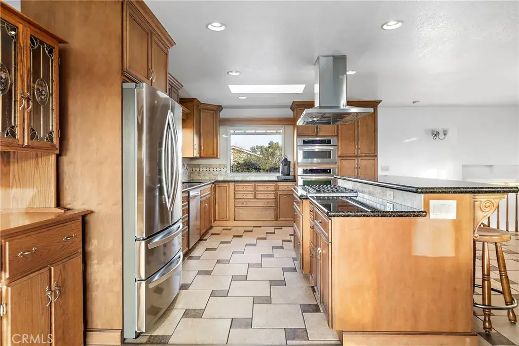 The kitchen, open to the main living area, features a large center island with stainless steel overhead hood vent, granite counters, new soft-close cabinetry, ample storage, and a new tile floor, making it both stylish and functional.