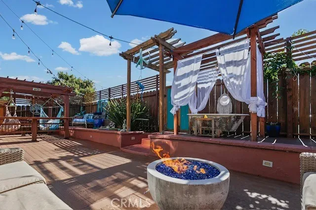 Outdoor living features include a thoughtfully designed backyard space with a gas fire pit, outdoor soaking tub, and areas for relaxation and entertaining. From the upper front bedroom, there is a peek of the ocean.